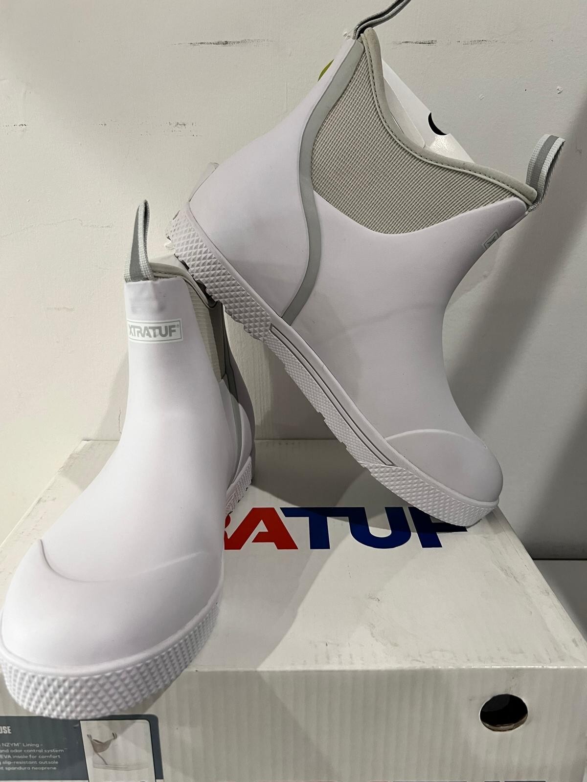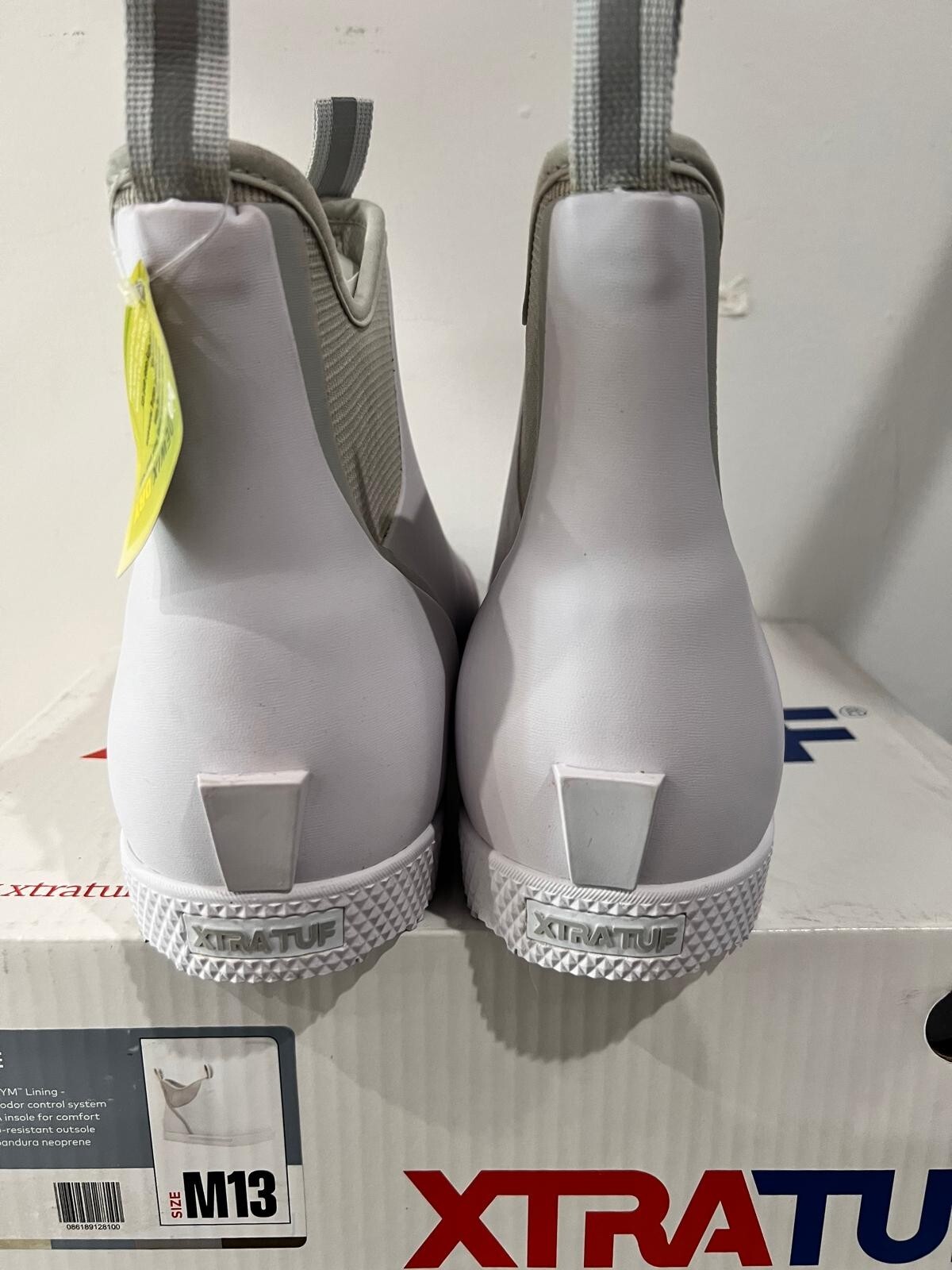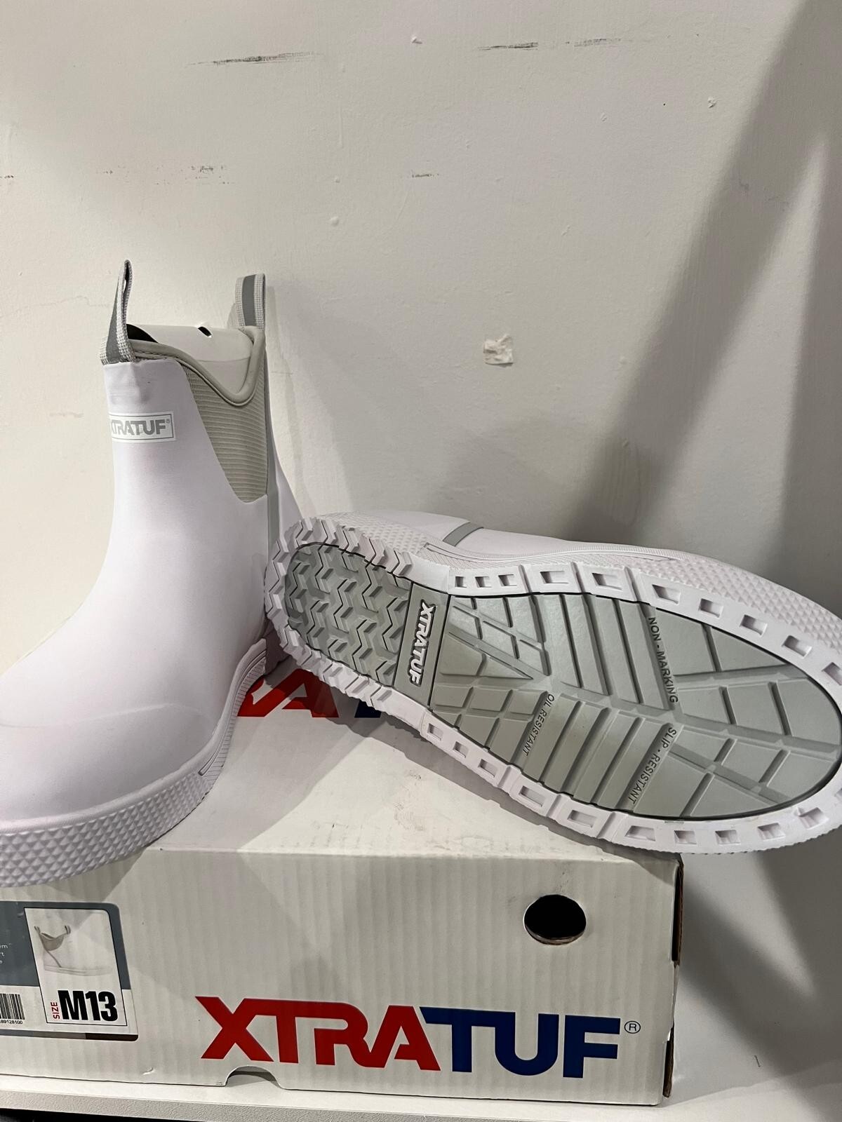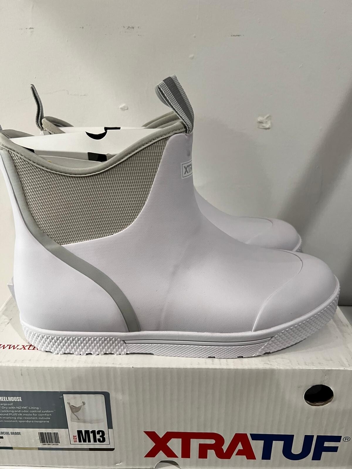 Introducing the Xtratuf Men's Wheelhouse Commercial Grade Deck Boot XMW-100 in white, size 13. This stylish rain boot is made of high-quality rubber and is perfect for any man looking to stay dry on a rainy day. The boot features a sturdy construction, making it ideal for commercial use. The Xtratuf brand is known for its quality products, and this boot is no exception. With its slip-resistant sole and durable upper material, it is sure to provide reliable performance for years to come. Whether you're running errands or working on a construction site, this boot is the perfect choice.