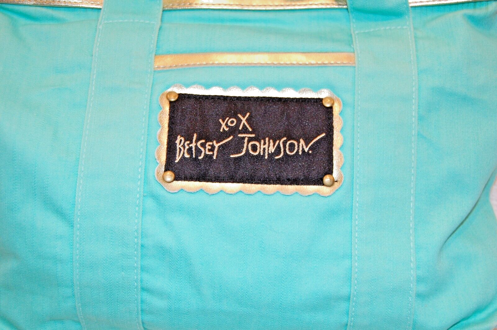 Betsey Johnson XOX Seafoam Green Cotton Small Tote. This Small Tote is in pre-owned condition. It was made exclusively for Redken . The gold accents really made this bag pop. It is 8.5 inches tall, 11 inches long, 2 inches deep and has a strap drop of 5 inches. This is a Betsey Johnson XOX mini tote made with seafoam green cotton and features a reversible design. The bag has a square shape and measures 11 inches in length, 8.5 inches in height, and 2 inches in depth. The top handle is made of green cotton and has a drop of 5 inches. The bag is perfect for casual occasions and has a leopard pattern on the inside lining which is made of cotton. The bag comes with a pouch and has Betsey Johnson's logo as an accent. This unit is a great addition to any women's bag collection.