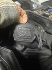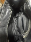The Y2K Coach Black Bag Purse Shoulder Bag is a vintage piece from the iconic Coach brand, featuring a solid black leather exterior with silver hardware accents. This medium-sized rectangular bag has a zip closure and a black shoulder strap handle, making it a stylish and practical accessory for any woman's wardrobe. The interior is lined with black fabric and includes inner pockets for organization. With its classic design and timeless appeal, this Coach Y2K bag is sure to become a staple in any fashion-forward individual's collection.