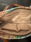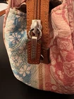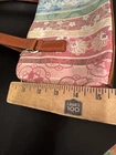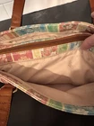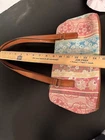 The Y2K FOSSIL Rainbow Floral Paisley Shoulder Bag is a vintage women's purse featuring a colorful floral pattern in a rectangular shape. The bag has a zip closure, brown leather handle/strap with a 9-inch drop, and silver hardware accents. It is medium-sized, lined, and has inner dividers, making it suitable for travel and casual occasions. The coated exterior material is leather with a multicolor rainbow theme, while the interior lining is beige fabric. This Fossil Key Per model also includes a bag charm and key accessories, adding a touch of style and practicality to any outfit.