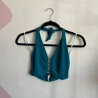 American Eagle Womens Y2K Blue Long Sleeve Fitted Cropped Ruched Top Medium