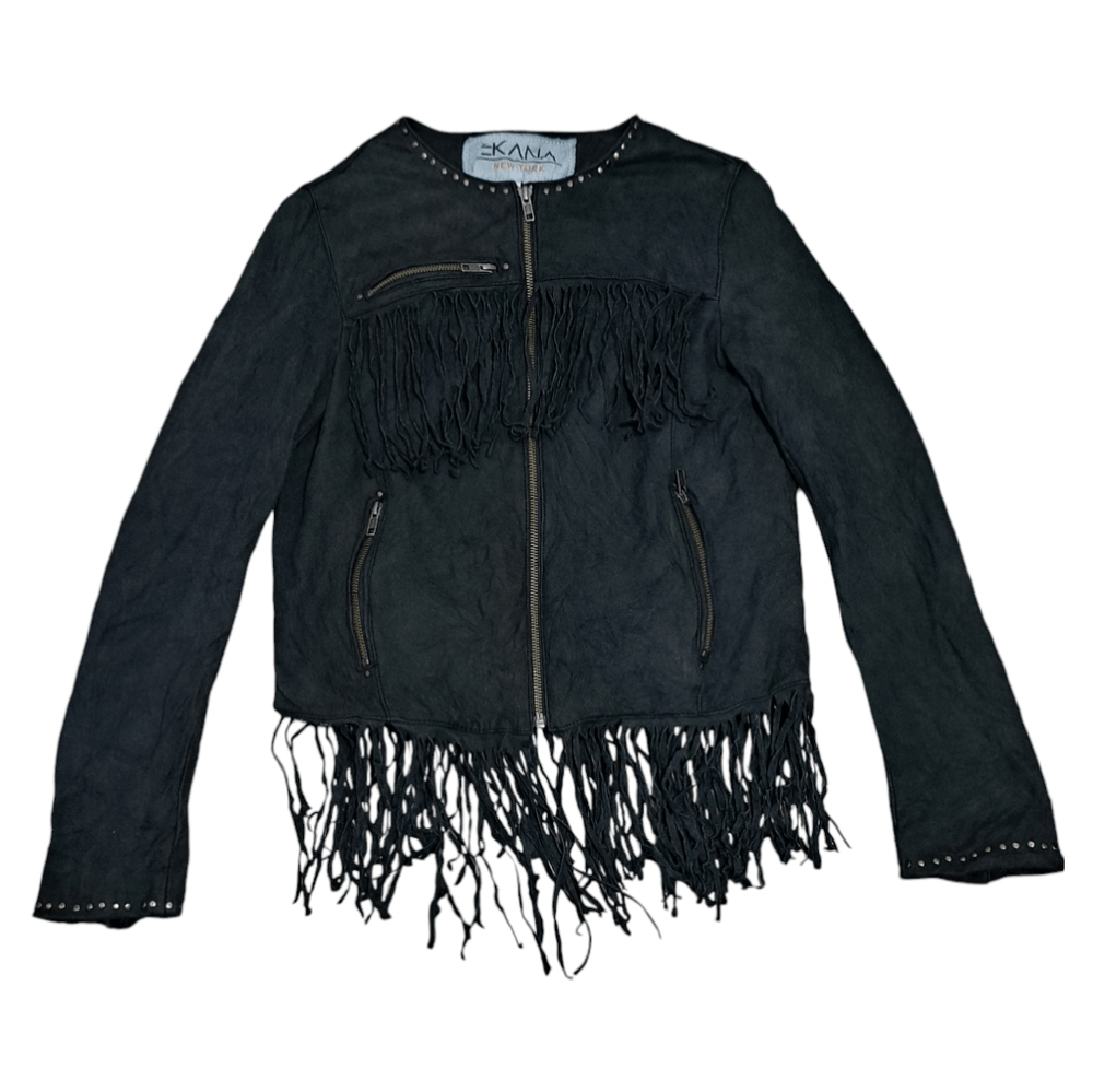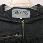Ekana New York Y2K Gothic Studded Leather Fringe Jacket Cowgirl Punky Streetwear Medium Black ▪︎In excellent used good condition, shows some wear especially on the fringe trim 2 of it was pulled out. Please check photos for details, no holes, no rips ▪︎It's one of a kind piece, very unique, ▪︎With Studs Detailing on the neckline, Cuffs Hem ▪︎Pockets with zip closure ▪︎Lined ▪︎From Smoke free and pet free house ▪︎If you like it make an offer all reasonable offers accepted Measurements ☆Length- 20 inches 26 inches Included the fringe ☆Bust- 18 inches Pit to Pit ☆Sleeve Length- 17.5 inches Pit to Cuffs Western, southwestern, ranch, country, Aztec, cowgirl, rodeo, wrangler, cowboy, rancher, farm girl, farmer, barn, fringe, tassels, equestrian, riding gear, horse show, horse girl, English, muck, paddock, line dancing, square dancing, chore, rural,