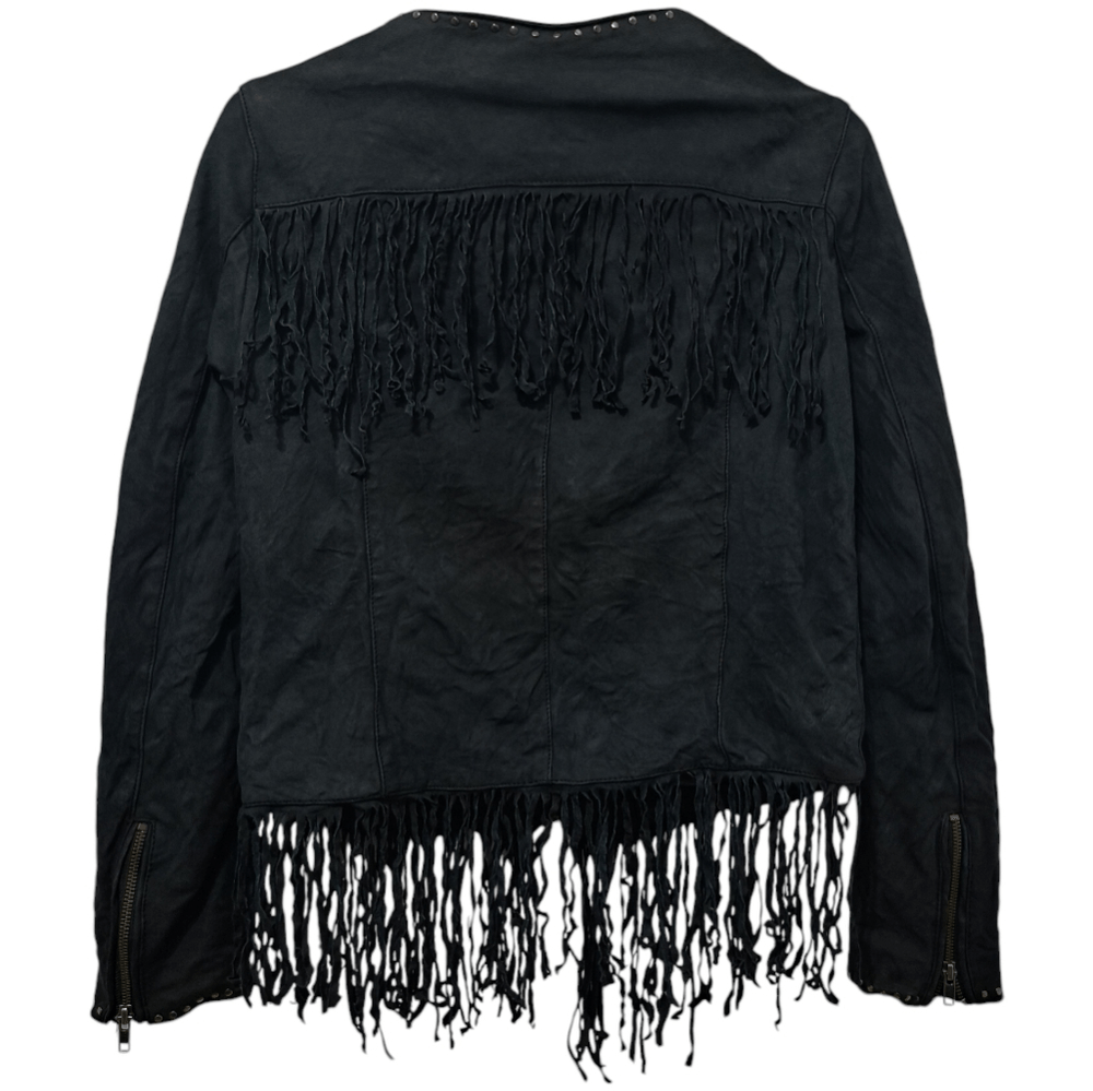 This jacket is a total showstopper! The studded details and fringe give it such a cool, edgy vibe—perfect for making a statement. Even with some minor wear on the fringe, it’s still in great shape and feels super unique. The fit is spot-on, and the zip pockets are a nice touch. Love the punk-cowgirl energy—definitely a standout piece!