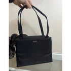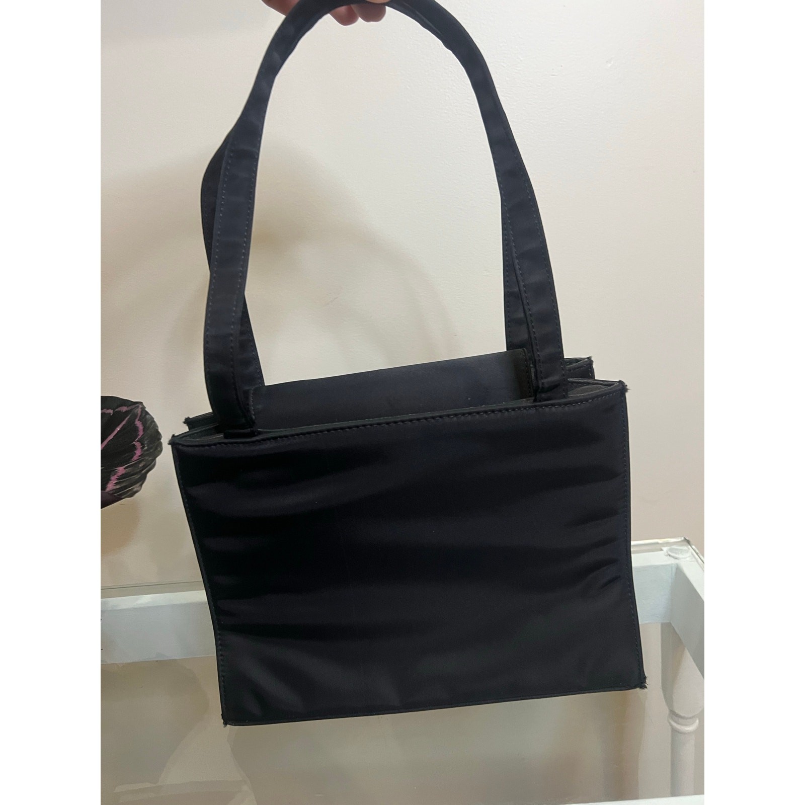 This Kate Spade shoulder bag purse exudes Y2K and 90s vibes with its mini size, black nylon exterior, and black nylon lining. The bag features a zip closure, black hardware, and a 7" handle drop, making it a stylish and practical accessory for women. The solid black color, Kate Spade branding, and sleek design make this shoulder bag a versatile choice for everyday use, adding a touch of retro-inspired fashion to any outfit. Not perfect, but still very cute usable bag