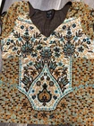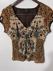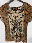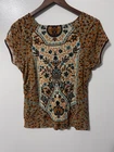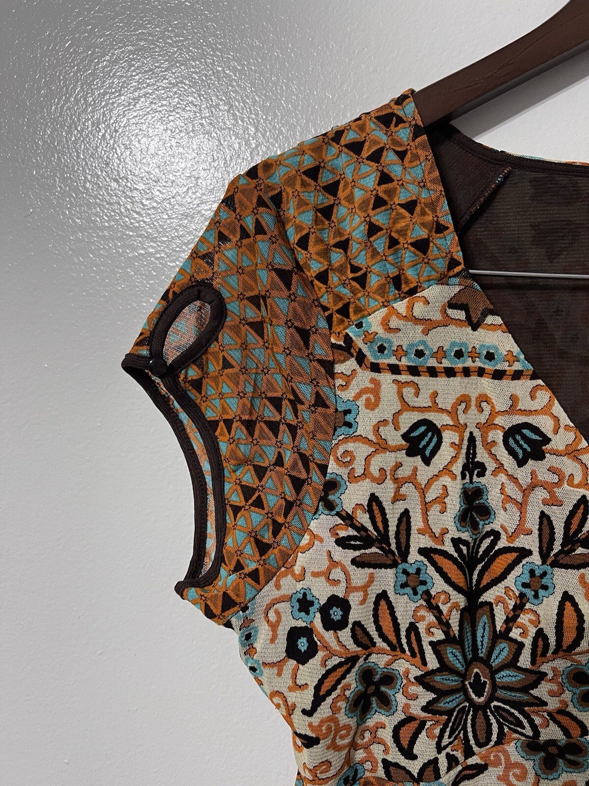 This Y2K Nicole Miller Babydoll Top in size XL features a colorful abstract pattern with a V-neckline and sheer mesh fabric. The top has a hippie and fairy vibe, making it perfect for parties, festivals, or casual wear. The lightweight cap sleeves and pullover closure add to its bohemian style, while the vintage design adds a unique touch to your outfit. Made of polyester and spandex, this blouse is machine washable and ideal for a stylish and carefree look. Looks new!!