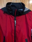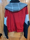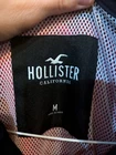 This is a Y2K retro-style women's windbreaker jacket by Hollister, featuring a multicolored design with a blue color scheme. It is made of polyester with a polyester lining and insulation, and has a zip closure and hood. The jacket is lightweight and suitable for casual occasions in winter and spring. The size is medium and it has a regular fit. The jacket also has zipper accents and is machine washable.