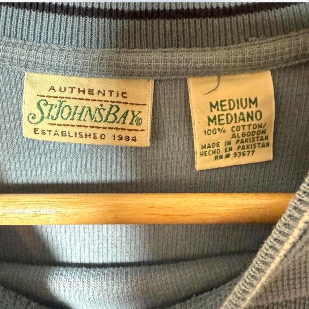 Authentic St. John’s Bay short sleeve ringer tee, size Medium. Classic blue with white and navy contrast stripes on collar and cuffs. 100% cotton textured knit adds dimension and weight. A true vintage piece likely from the late 1990s or early 2000s — perfect for fans of retro, Y2K, or 90s aesthetic. Condition: Excellent vintage condition. No stains or holes. Fabric: 100% Cotton. Made in Pakistan.