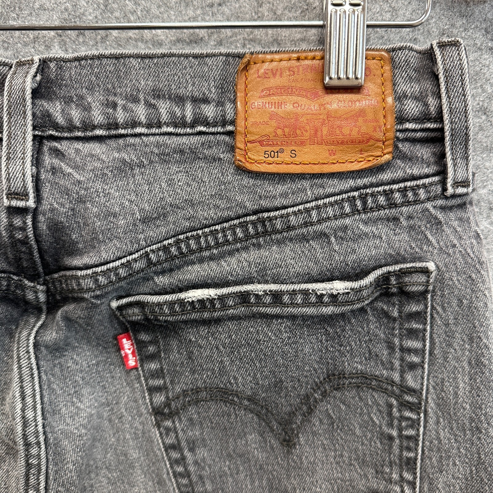 Step back into early 2000s cool with these Levi’s® 501® S Premium jeans in a perfectly worn black/gray wash. Featuring a classic button fly, mid-rise waist, and straight-leg fit, these jeans are everything we loved about Y2K denim. Made from sturdy cotton denim with authentic fading and light distressing, they channel effortless vintage edge. This style is part of Levi’s Premium line, known for elevated quality and fits. The "S" on the patch indicates a slimmer or special variation of the 501 cut. Details: Style: 501® S Premium Color: Washed Charcoal Gray Waist: 29" Inseam: 27" measured flat Rise: Approx. 10.5" Leg opening: Approx. 6" flat (12" circumference) Button fly, Levi’s rivets, leather patch Condition: Pre-owned with broken-in softness, authentic fading, light fraying on pocket edges Material: 99% Cotton, 1% Elastane Tag Code: PC9-29502-0063 Made for international market (care tag in multiple languages) A staple piece for grunge, Y2K, or minimalist wardrobes. Please review all photo measurements to ensure fit. Ships from a smoke free home in California.