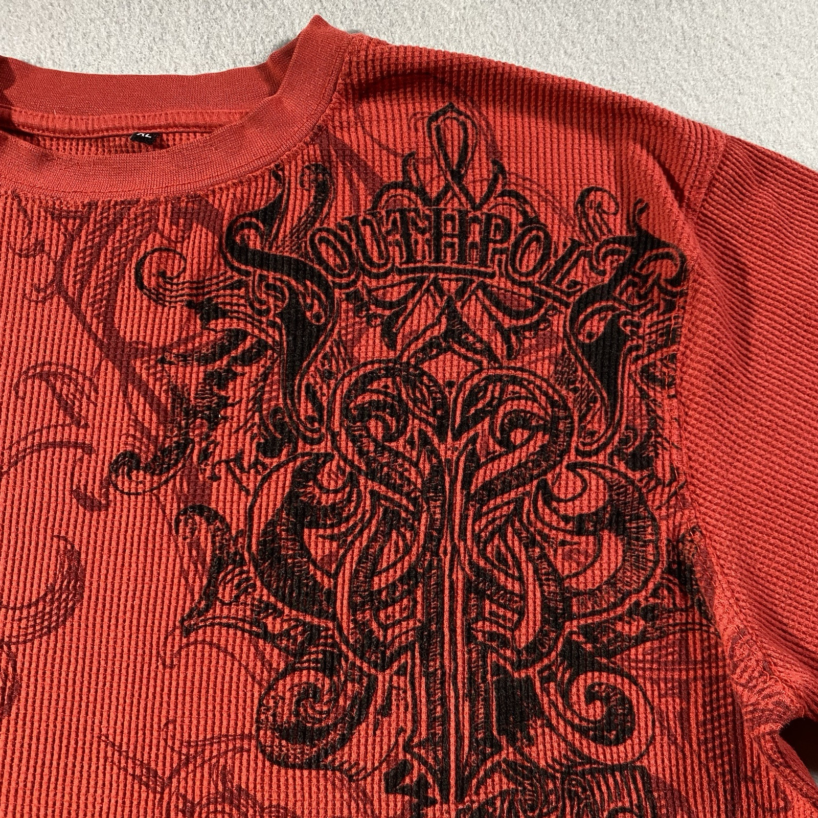 Elevate your wardrobe with this vintage Southpole thermal long sleeve shirt. The waffle knit design and embroidered logo add a touch of streetwear to your outfit. This shirt is perfect for all seasons, with its breathable and easy care features. The solid red color and crew neck design make this shirt a versatile addition to your collection. It's made of a blend of polyester, cotton, and cotton blend materials, and is machine washable. The shirt is perfect for biker, city, grunge, and retro themes.