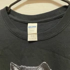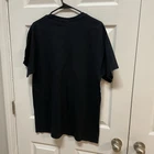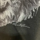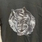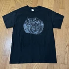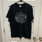 This is a black Gildan T-shirt in size L for men, featuring a graphic print of wolves in a nature-inspired design. The shirt has short sleeves, a crew neck, and is made of cotton knit fabric. The graphic tee has a 90s aesthetic with a wolf pack theme, perfect for those who appreciate outdoor and animal motifs. The shirt is easy to care for and offers a regular fit for comfortable wear.