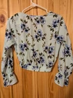 Fairycore meets whimsigoth with this enchanting blue floral v-neck crop top in size small. Featuring a delicate, ethereal floral print, this top excuses dreamy, mystical vibes while the soft, flowy fabric drapes beautifully for a flattering fit. The deep v-neck line adds a touch of elegance.