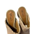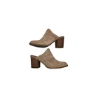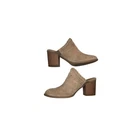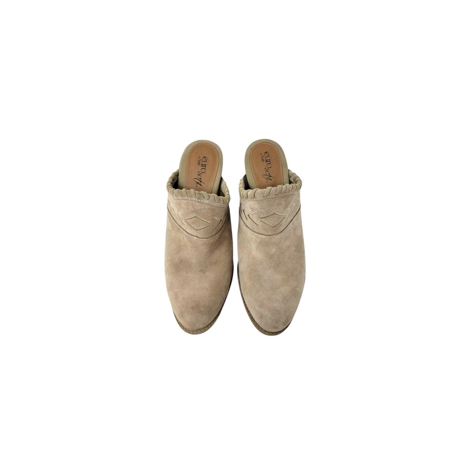 The Y2k Euro Soft By Sofft Women's Leather Mule Clog in size 8.5 US features a unique boho stitched heel design, giving it a trendy and stylish look. Made with leather suede material in beige color, this mid-heel clog is both comfortable and fashionable. The Sofft brand ensures quality and the leather lining and insole provide a luxurious feel. Perfect for women looking for a blend of vintage charm and contemporary flair in their footwear.
