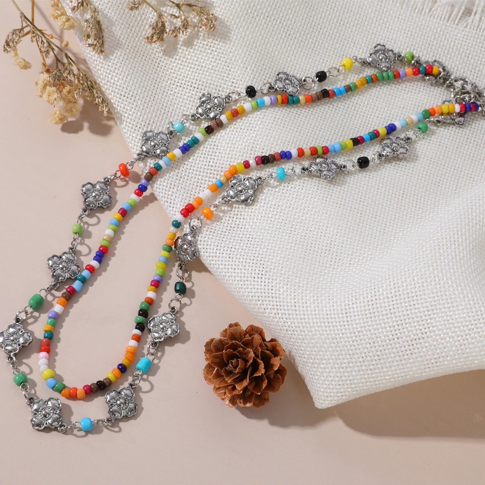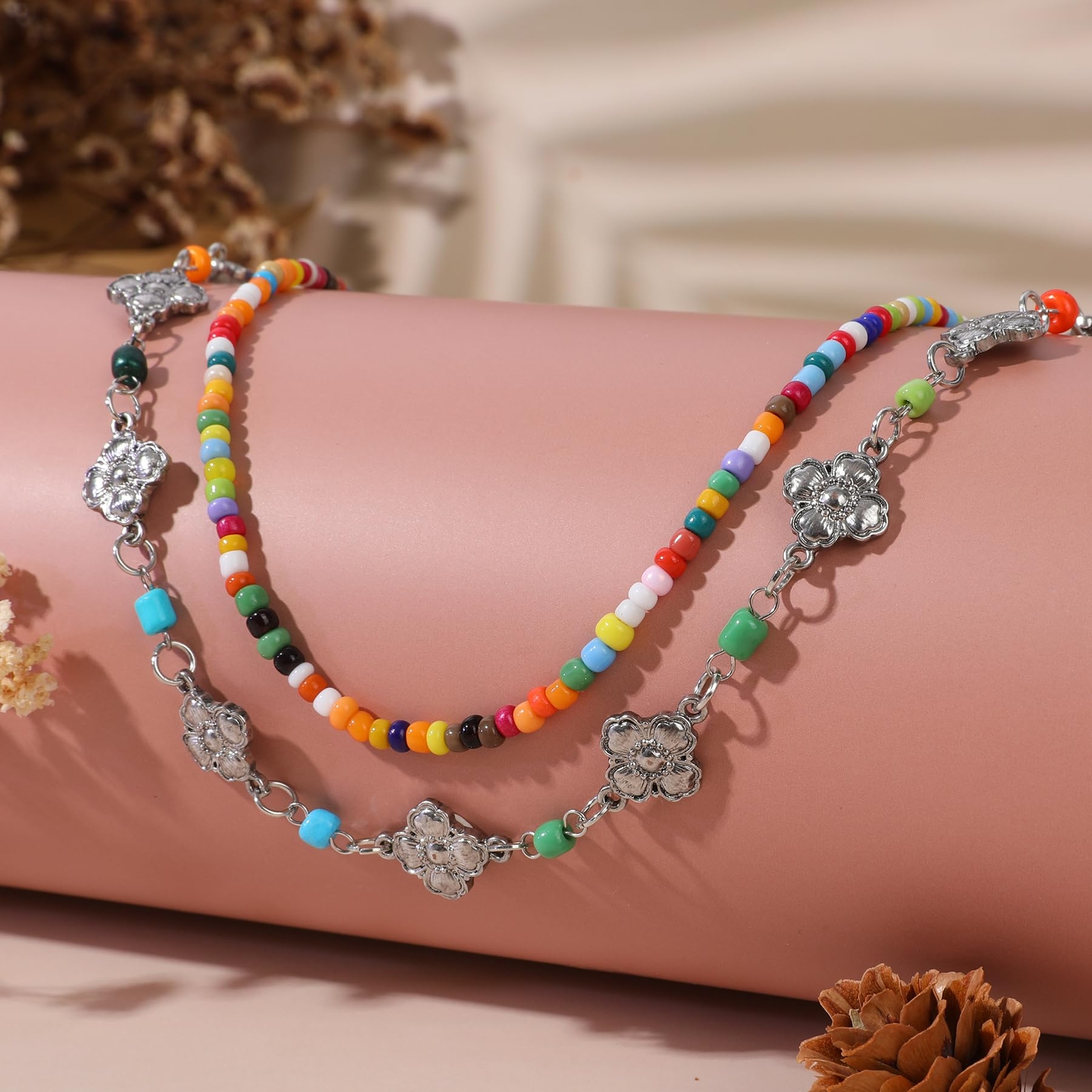 【Unique Dual Chain Design】Enhance your style with our beautifully crafted Y2k Flower Layered Choker Necklace, featuring a distinctive dual chain design. The shorter necklace is adorned with vibrant, colorful rice beads that add a pop of color and fun to your outfit, while the longer chain is elegantly decorated with delicate silver flower charms, creating a harmonious and eye-catching combination. 【High-Quality Materials】This flower layered choker necklace is made from durable alloy and high-quality rice beads, ensuring a robust and polished finish. The alloy provides strength and longevity, while the rice beads and silver flowers add a touch of elegance and sophistication to your look. Each element is carefully selected and crafted to ensure a premium accessory that stands the test of time. 【Versatile and Trendy】Perfect for any occasion, whether it's a casual day out or a formal event, this flower choker necklace adds a chic and trendy touch to any outfit. Its versatile design allows you to wear it as a standalone statement piece or layer it with other necklaces to create a stylish, bohemian-inspired look. The combination of colorful beads and silver flowers makes it suitable for a variety of fashion styles. 【Comfortable Fit】Designed with comfort in mind, the flower layered choker necklace features a short chain that sits gracefully around your neck, complemented by a longer chain that adds a stylish layered effect. The lightweight materials ensure that you can wear it all day without any discomfort, making it a perfect accessory for daily wear or special occasions. 【Perfect Gift】Looking for a thoughtful and stylish gift? This Flower Choker Necklace is an ideal choice for birthdays, anniversaries, holidays, or any special occasion. It comes beautifully packaged and ready to be presented to a loved one, making it a meaningful and elegant addition to any jewelry collection. Show someone special how much you care with this unique and beautiful flower layered choker necklace.