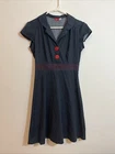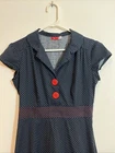 This Y2K era dress checks all the boxes for the most amazing pinup style dress ever! Navy blue, red stitching, giant red buttons with a nautical anchor on them, cap sleeves, collared neckline, midi length, and polka dots! This piece is tagged a large, but in modern sizing it's more like a small or maybe a medium - PLEASE check measurements below to ensure it's a good fit for you! Bust: 35" Waist: 27" Length: 37"
