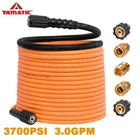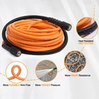 Highlights Industry performance upgarde for USA customers, More Strong and More Durable designed for daily and skillful power washing job. Rated 3700 PSI work pressure, will maximize the potential power of your pressure washer. [Burning Resistant] Come with heat resistant tube, this will solve the common pain point of all plastic hose, prevent your hose from being burning by hot muffler and pump. [Most Wearable Polymer Power Washer Hose] The highest WEAR RESISTANT hose from industry power washer engineering, similar pressure perfomance and more lightweight than rubber hose, but 2X wear quality than residential grade plastic polymer pressure washer hose [Flexible Design] YAMATIC unique technology provide your with no permanent memory for kink resistant. Professional performance also intergrade the flexible structure without glue, the highest balance of performance and flexible and enviroment, from our green ideas for customers [3/8" USA Standard Quick Connect] The desgin meet the USA standard of high pressure up to 4000 PSI. VERY IMPORTANT, brass connection is awesome friend for your power washer and accessories, more durable and strong than aluminum thread under the high pressure. Features: 1.MAX PSI: 3700 PSI 2.GPM: 3 GPM 3.Connection: M22-14mm ends/3/8" USA Standard Quick Connect 4.Inner Diameter: 1/4 inch 5.Length: 50 ft 6.Max. Water Temp.: 140℉