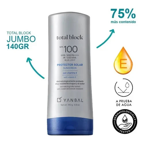 Bloqueador Muy alta protección! Protege contra el 100% los rayos dañinos del sol (UVA, UVB), rayos IR y luz azul. Brinda hidratación, es resistente al agua y al sudor. Además, es de rápida absorción! ¿Para quién lo recomendamos? Para todo tipo de piel. Textura:Suave y no grasosa, se desliza fácilmente y de manera uniforme. Orgullosos de:Recomendado por el SKIN CANCER FOUNDATION (Active Seal). Filosofía:En Yanbal, unimos la mayor innovación tecnológica con ingredientes únicos, para ofrecerte productos de calidad. Conoce los resultados:+ 99% de protección UV, IR y luz azul. Pruebas de eficacia pensadas en ti INGREDIENTES Vitamina E: Potente antioxidante que hidrata la piel y la protege de los radicales libres. UV MAX Technology: Combinación de filtros que permite una efectiva protección de amplio espectro contra el 100% de rayos dañinos del sol. Emolientes Naturales: Hidratan, suavizan y protegen.