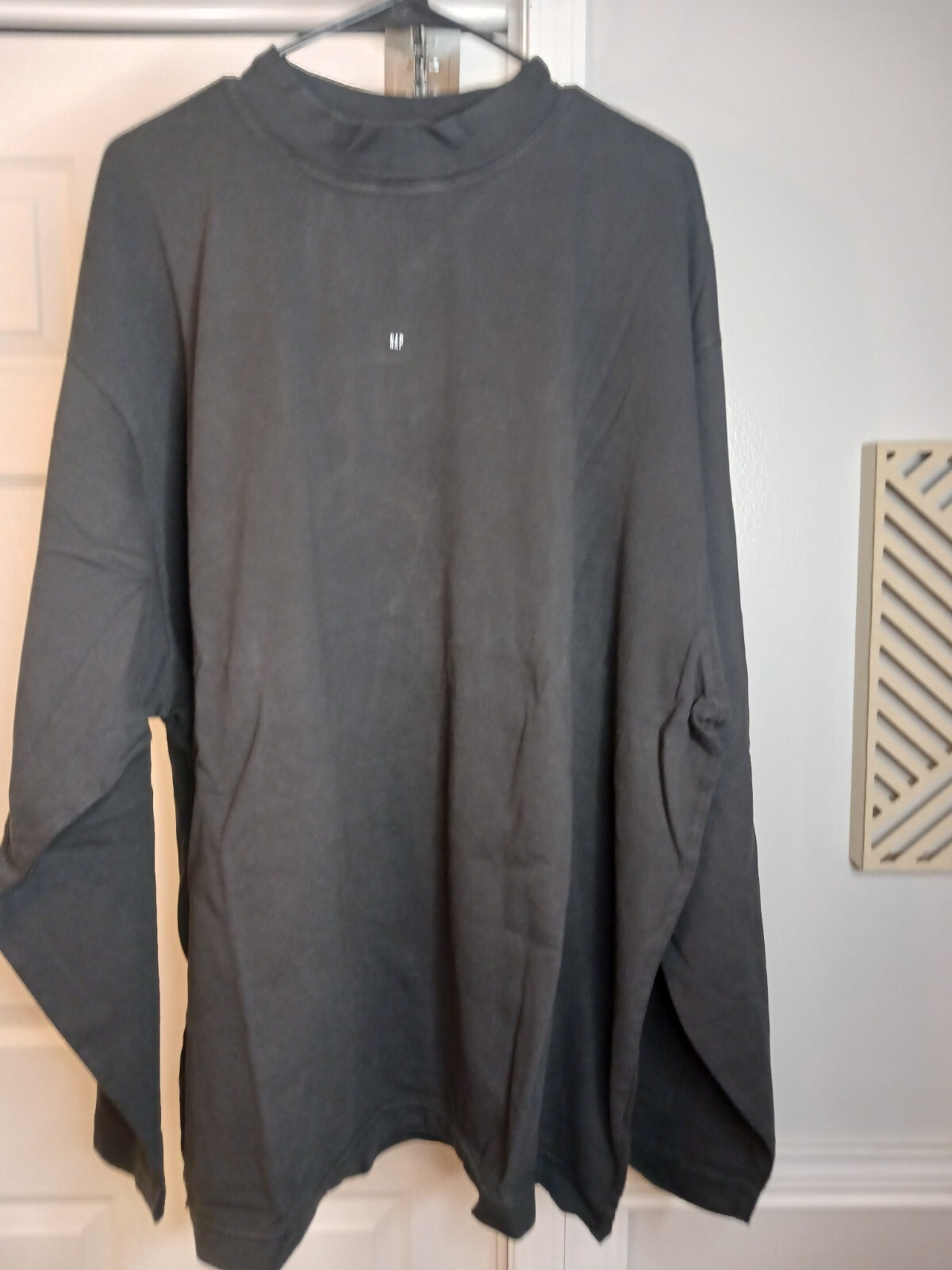 This YEEZY GAP Balenciaga High Neck Long Sleeve Tee Shirt in black is designed for men in a size L. Made of cotton, it features a crew neck and an oversized fit, perfect for a comfortable and stylish look. The tee shirt includes a logo accent, adding a touch of branding to the minimalist design. Suitable for all seasons, this versatile piece can be worn during winter, summer, fall, and spring.
