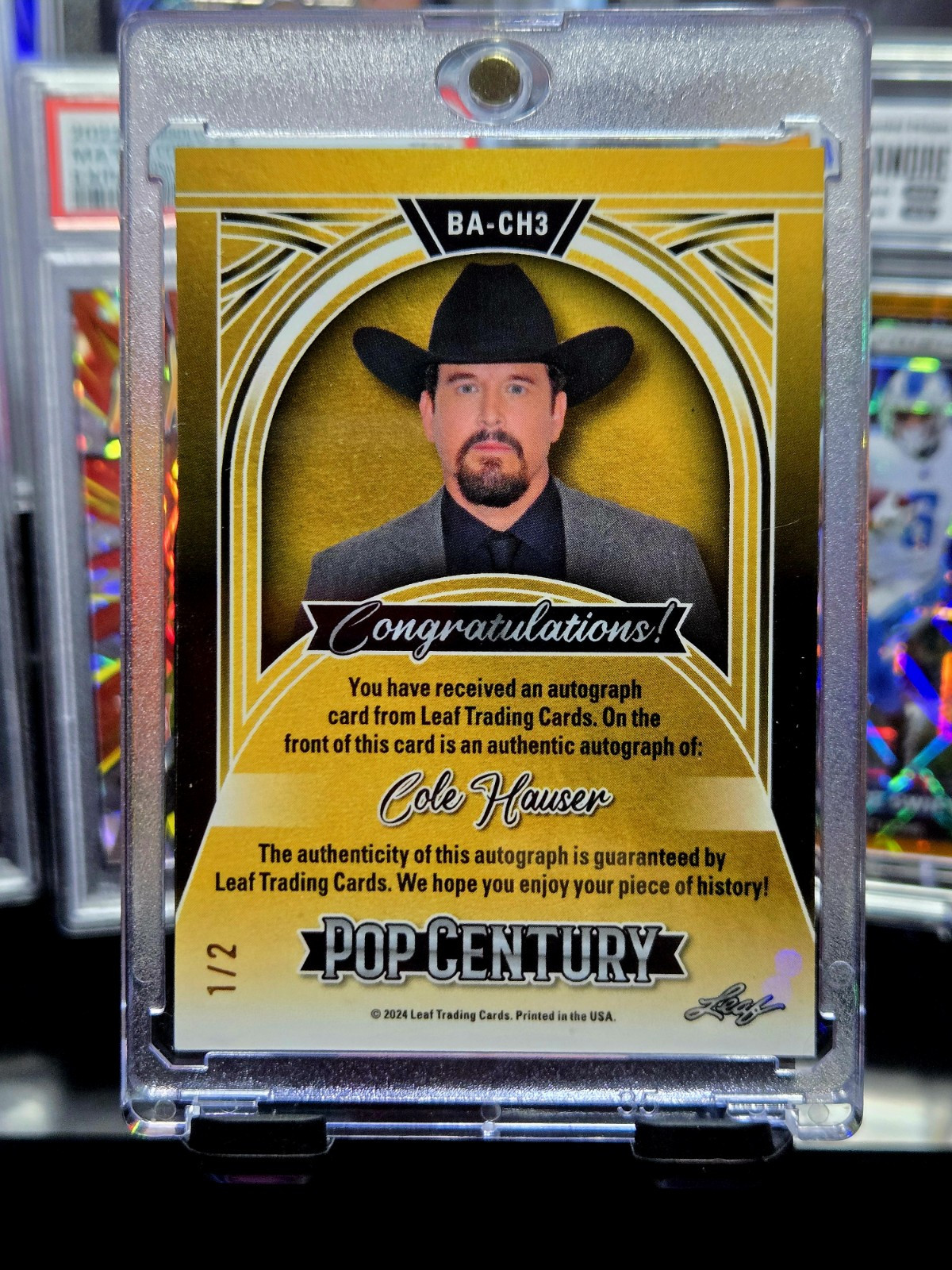 COLE HAUSER 2024 POP CENTURY AUTOGRAPH CARD 1/2 is a highly collectible non-sport trading card featuring the popular character Rip Wheeler from the TV show Yellowstone. This limited edition card is autographed by Cole Hauser himself, making it a unique and valuable addition to any collector's repertoire. Manufactured by Leaf in the United States, this card is printed on high-quality card stock and comes in a standard size, perfect for display or trading among enthusiasts of Western and history genres.