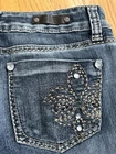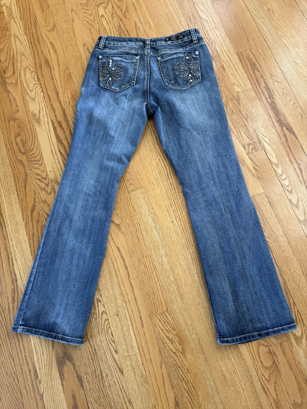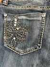These Royalty by YMI Petites women's jeans in size 8 feature a dark wash denim with studded accents, a flared leg style, and a mid-rise fit. The jeans have a 5-pocket design with button closure and are made of a blend of polyester, spandex, and cotton for a comfortable and stylish look. They have a "Kendrick" vibe with the flared legs. Loved these jeans, they just don't fit anymore. Hoping to find a new owner to ROCK these jeans!