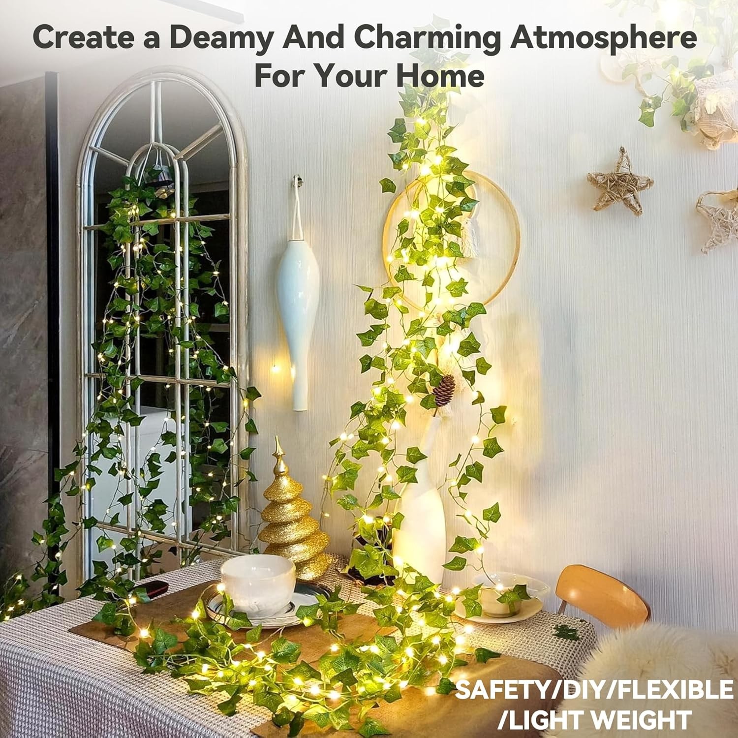 YOUNGAR Vines with Fairy Lights, 23FT 73LED Ivy Leaf Lights 73LED, Warm White LuxeFusion Product Description Features Aesthetic Ivy Lights: Elevate your space with warm ivy lights—perfect for indoor or outdoor settings. Ideal for dorms, classrooms, bedrooms, weddings, gardens, or living rooms. Battery/USB Power & Waterproof: Use the fairy lights with a waterproof battery box (batteries not included) or via USB for eco-friendly, versatile power. The IP44 waterproof design ensures reliable performance, rain or shine. Bendable Copper Wire Lights: Shape and mold the vine twinkle lights easily to create custom displays on walls, shelves, trees, or any décor. Ideal for creating a unique and personalized look. 8 Lighting Modes & Timer: Enjoy 8 flashing modes and set the timer for 6 hours on, 18 hours off, to create an enchanting lighting experience automatically. Complete Package: You get 1 string of 73 LED Ivy lights, a waterproof battery box, USB cable, and cable ties. Contact us for any support—add a soft glow to your home today! Product Details Color: Warm White Brand: YOUNGAR Indoor/Outdoor Usage: Indoor Special Feature: Timing Function, Battery or USB Operated, Waterproof Light Source Type: LED Power Source: Battery Powered Light Color: Warm White Theme: Daily, party,holiday, Leaf Occasion: Dorm, Bedroom, Classroom, Back to School, Home,Party,Wedding Controller Type: Touch Control Number of Light Sources: 73 Number of Items: 1 Control Method: Touch Water Resistance Level: Waterproof Seasons: All Seasons Form Factor: Fairy Lights Manufacturer: Linhai Qixiang Lighting Co., Ltd Item Weight: 8.1 ounces Package Dimensions: 6.02 x 5.71 x 3.23 inches Special Features: Timing Function, Battery or USB Operated, Waterproof Batteries Required?: No Package Dimensions : 6.02 x 5.71 x 3.23 inches; 8.15 ounces Manufacturer : Linhai Qixiang Lighting Co., Ltd Color: Warm White Brand: YOUNGAR Indoor/Outdoor Usage: Indoor Special Feature: Timing Function, Battery or USB Operated, Waterproof Light Source Type: LED Power Source: Battery Powered Light Color: Warm White Theme: Daily, party,holiday, Leaf Occasion: Dorm, Bedroom, Classroom, Back to School, Home,Party,Wedding Controller Type: Touch Control Free Shipping All orders ship free and fast to your doorstep. Easy Returns Satisfaction guaranteed. 30-day returns, no questions asked. 24/7 Support Contact us anytime; we’re here to help, day or night. Brought to you by LuxeFusion – Quality you can trust.