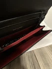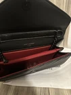 The Yves Saint Laurent YSL Envelope Wallet On Chain in Black on Gold is a luxurious crossbody bag perfect for various occasions. Made with a Black-plated chain strap and hardware, this small rectangular bag features a classic YSL design with accents like zipper closures and stitching. The beige exterior color and black accents add a touch of elegance to the bag, making it a stylish choice for those who appreciate luxury fashion. Black On Black Red interior Dust bag included, no box! Will receive as shown in images. Same day express shipping, great condition!