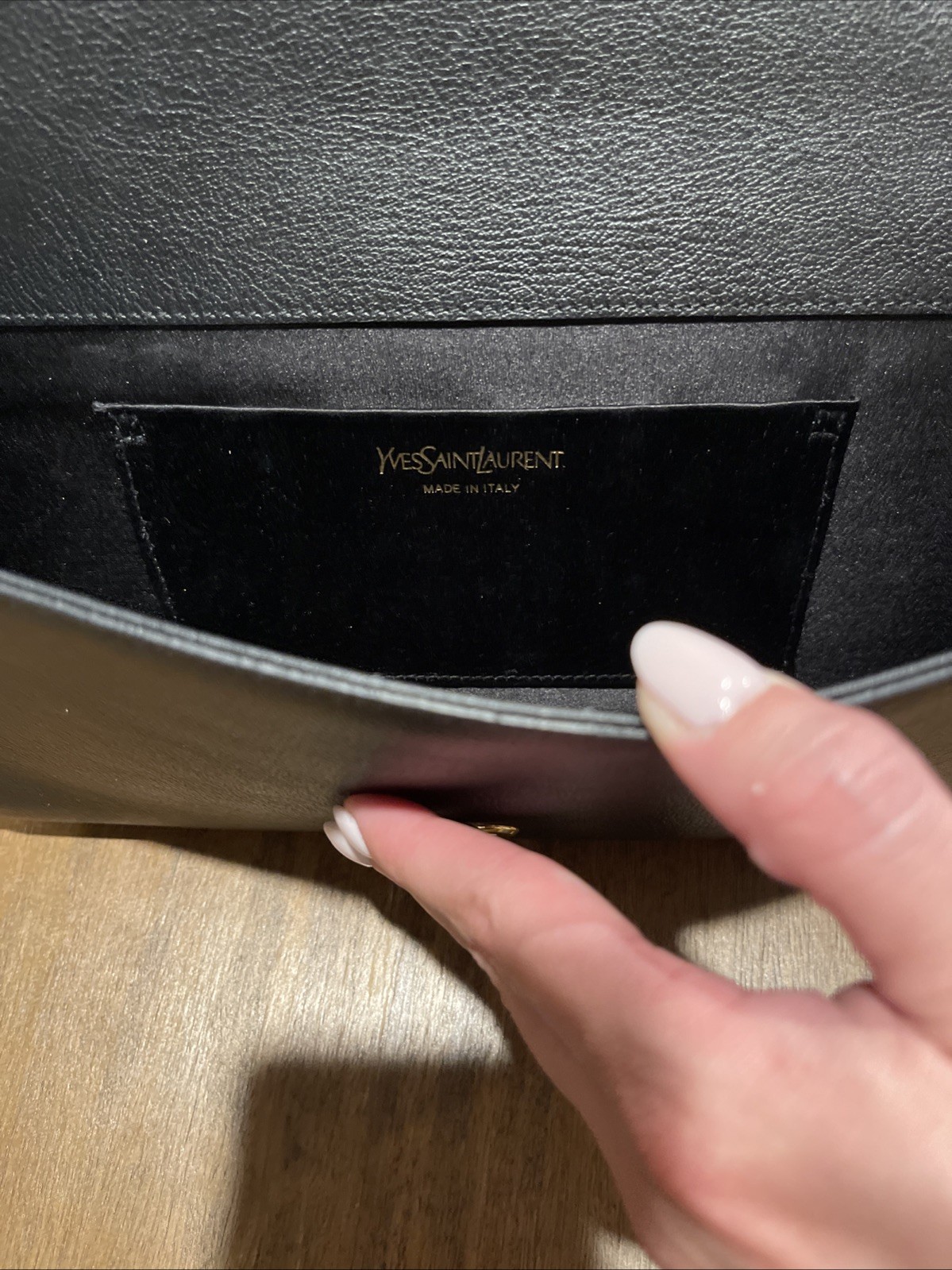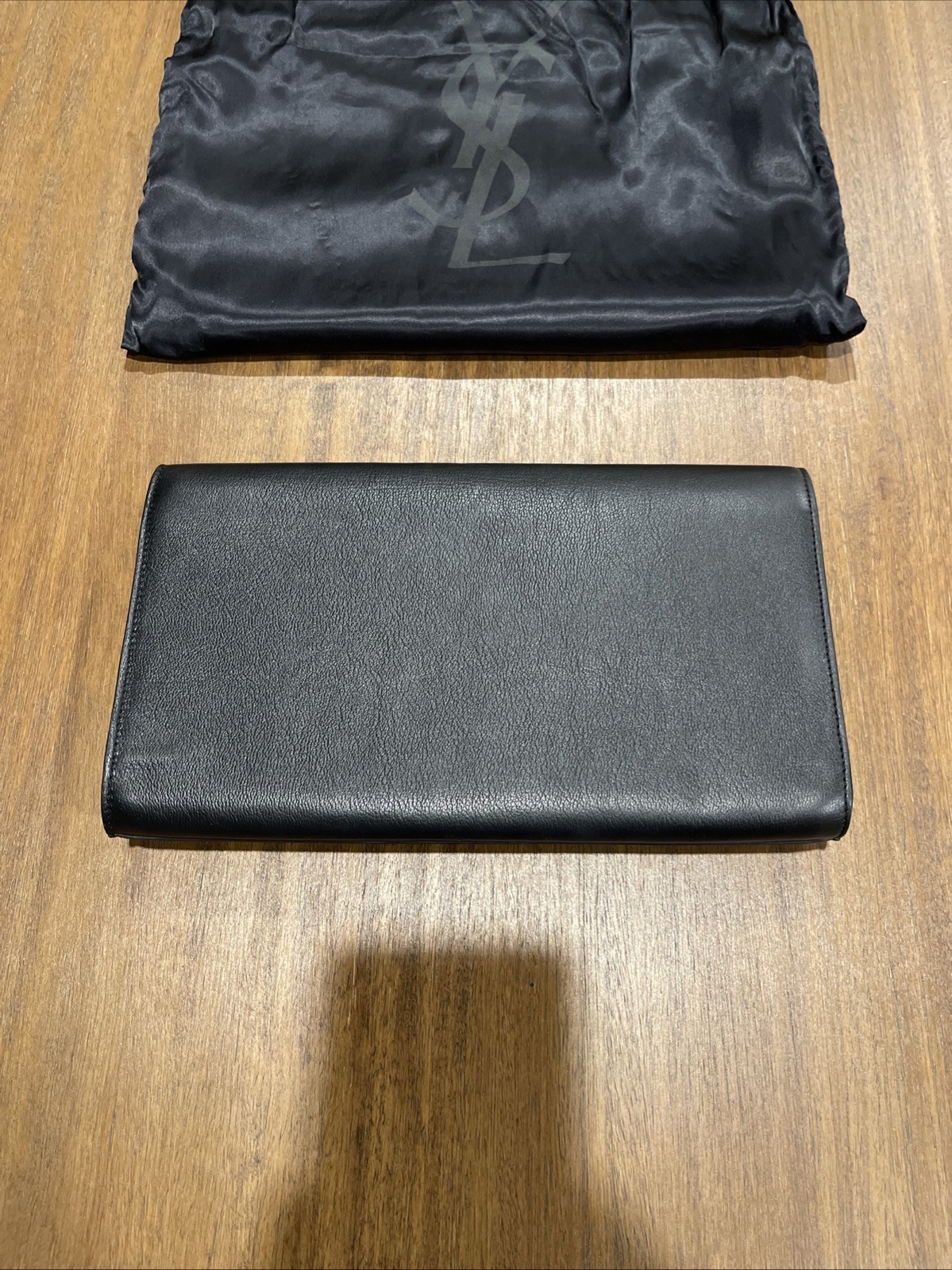 The YSL Leather Clutch with Logo Embossed Design is a stylish and luxurious accessory for women. Made from black patent leather with gold hardware accents, this large rectangular clutch features a magnetic closure and a satin lining. This clutch exudes elegance and sophistication, making it a perfect choice for any special occasion. Original bag included.