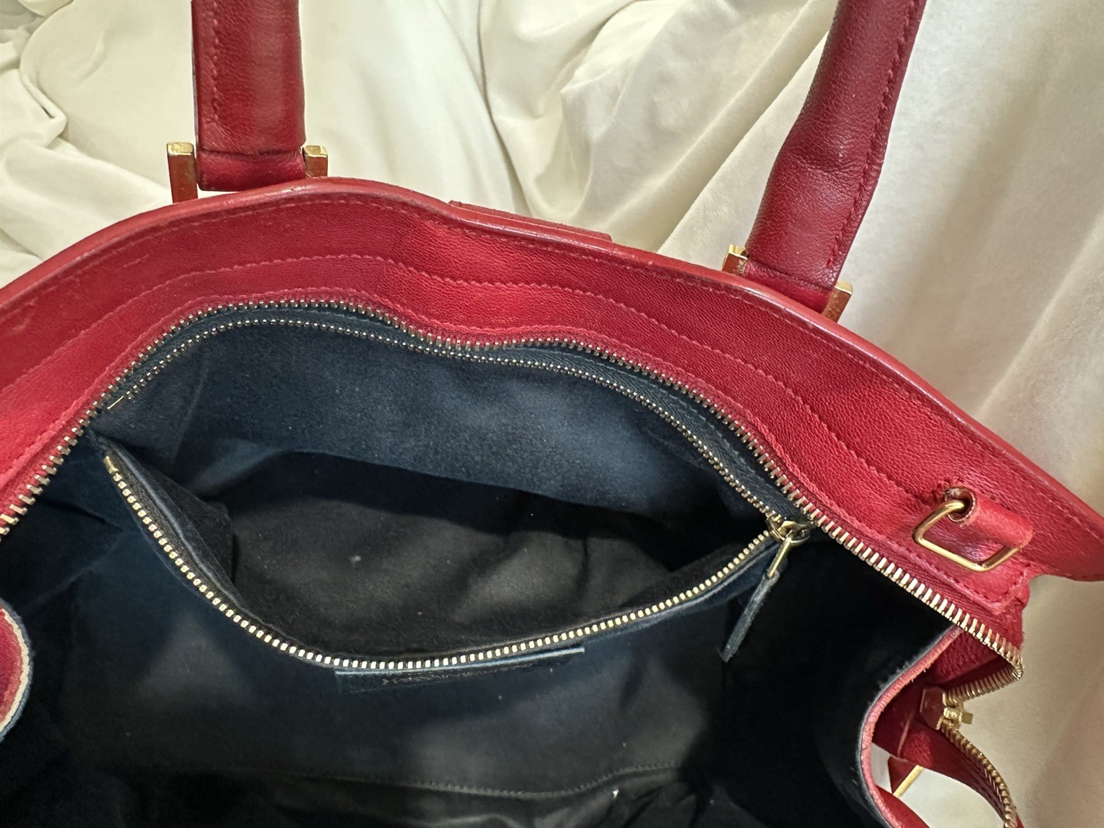 YSL Cabas Red ChYc Tote Bag Size Small Elegant red leather tote bag with gold accents. Perfect for any occasion. Overall Condition: good Exterior Condition: good Interior Condition: good Designer: Yves Saint Laurent Material: calfskin leather Includes: Saint Laurent dust bag Origin: Italy Production Year: 2013 Date/Authenticity Code: 311223.213317 Measurements: 11.75" L x 6" W x 8.5" H Interior Pockets: Two flat pockets Handles: Double rolled leather handles and long shoulder strap Handle Drop: 3.5" and 17" Closure/Opening: Two-way zip closure with leather flap tab and metal 'Y' magnetic snap Interior Lining: Fine textile lining Hardware: Goldtone