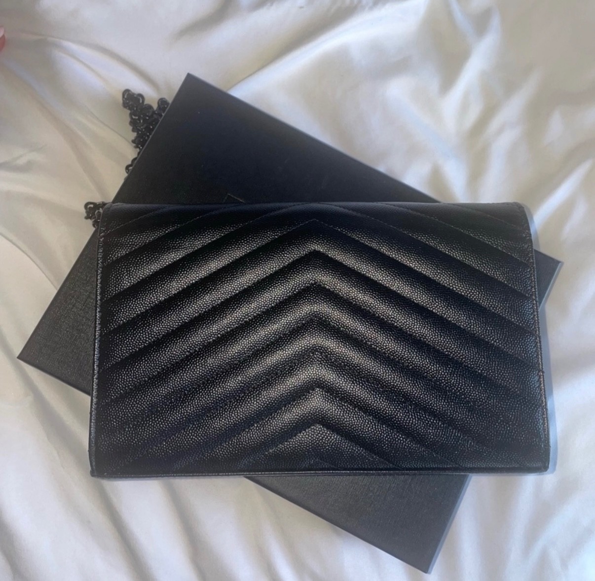 This YSL chain wallet is absolutely stunning—the black-on-black grain de poudre leather with chevron quilting looks even better in person! Lightly used and in perfect condition, it’s super practical with card slots, compartments, and a detachable chain for shoulder or clutch wear. A timeless piece that deserves to be shown off—someone’s getting a steal!
