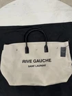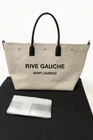 New 100% Authentic YSL Saint Laurent Rive Gauche Logo Canvas Black Maxi Shopping Tote Bag Retail price $2290 50% Cotton, 50% Linen Details 100% Leather Saint Laurent Rive Gauche logo print at front Internal logo patch Triple snap button top closure One main compartment with single zip pocket Two leather top handles Detachable and adjustable shoulder strap Measures approx 25"W x 16"H x 8"D Top handles with am 8" drop Detachable and adjustable shoulder strap with a 6.5" drop Made in Italy YSL Style No: 685543FAADW