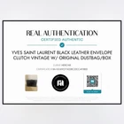Authenticated Vintage YSL Black Leather Quilted Clutch Bag - Excellent Condition! Step up your style with this stunning vintage Yves Saint Laurent clutch! Crafted from glossy black leather with iconic geometric quilting and a central strap closure, this chic purse exudes timeless elegance. The interior features the classic YSL monogram fabric lining, with a spacious compartment for your essentials and zipper pocket. Perfect for a night out or as a collector’s piece! Measurements (approx.): 10” L x 7” H x 2” D Condition: Excellent condition—lightly used with minimal wear, no major scratches or stains! See photos. Details: Made in Italy, iconic YSL design, perfect for evening wear or special occasions. Originally retailed for $800+. Will add a chain for free upon request.