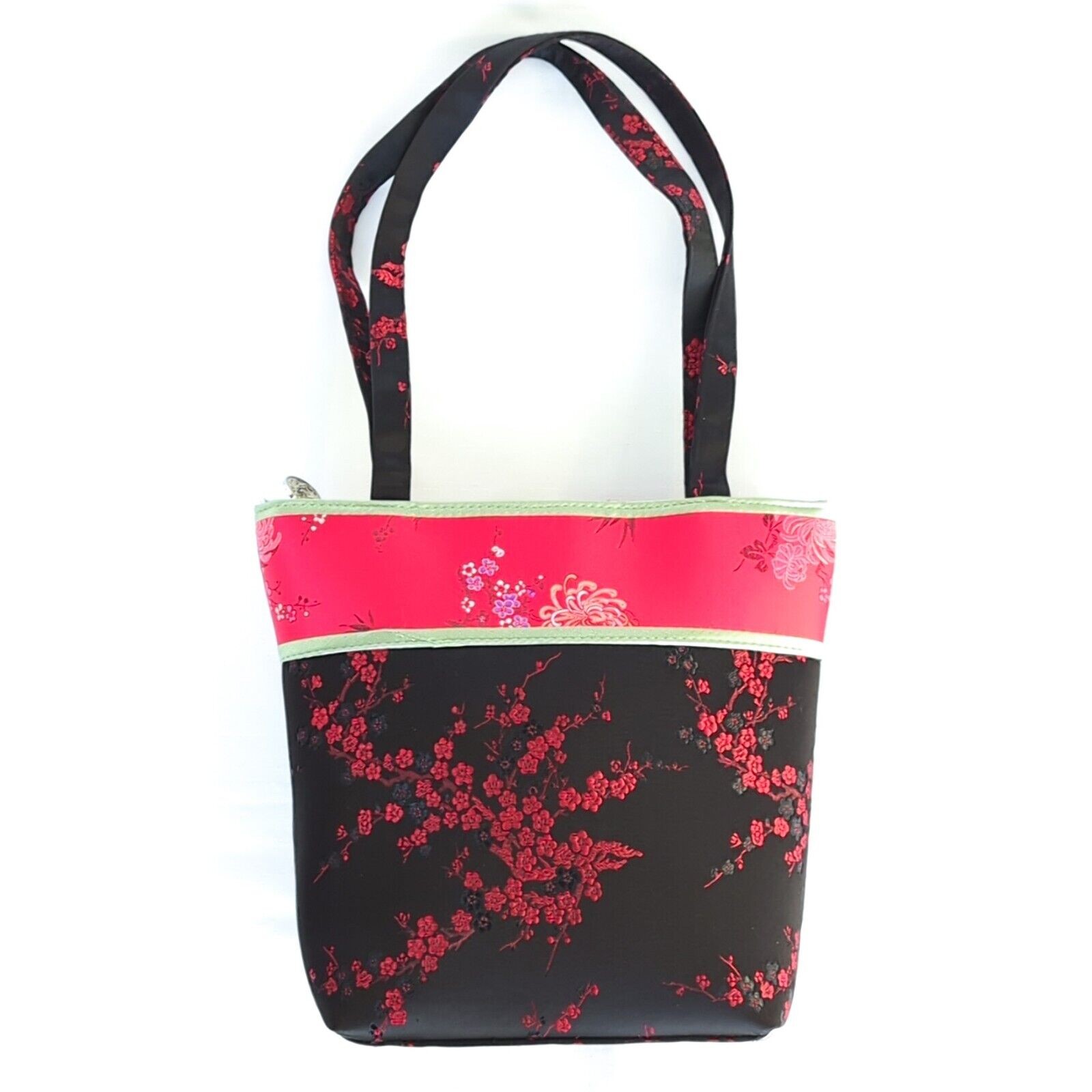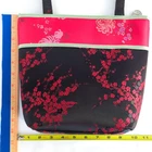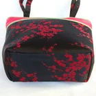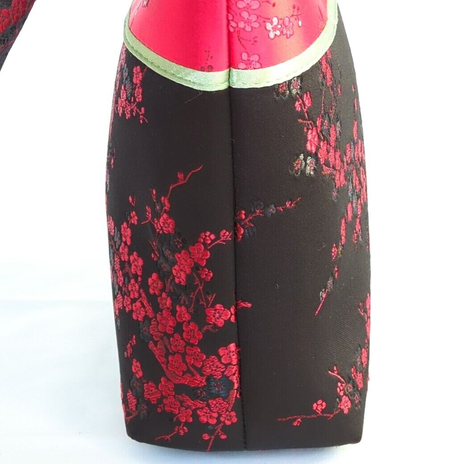Yans NY Shoulder Bag • Black and red • 100% Rayon with smooth satin weave • Brocade Floral Cherry Blossom detail • Top zip closure • Double handles with 10" drop • Inner zip pocket • 11" x 10" x 3.5" Gorgeous shoulder bag that resembles a tote bag, but is so lightweight and delicate that it works for more elegant events as well. This is a pre-owned item, in good condition. No stains, rips, tears or loose seams. I did include a couple photos of some nearly imperceptible snags I found while looking very close up. There are also two small pressure marks that I point out in the photos.