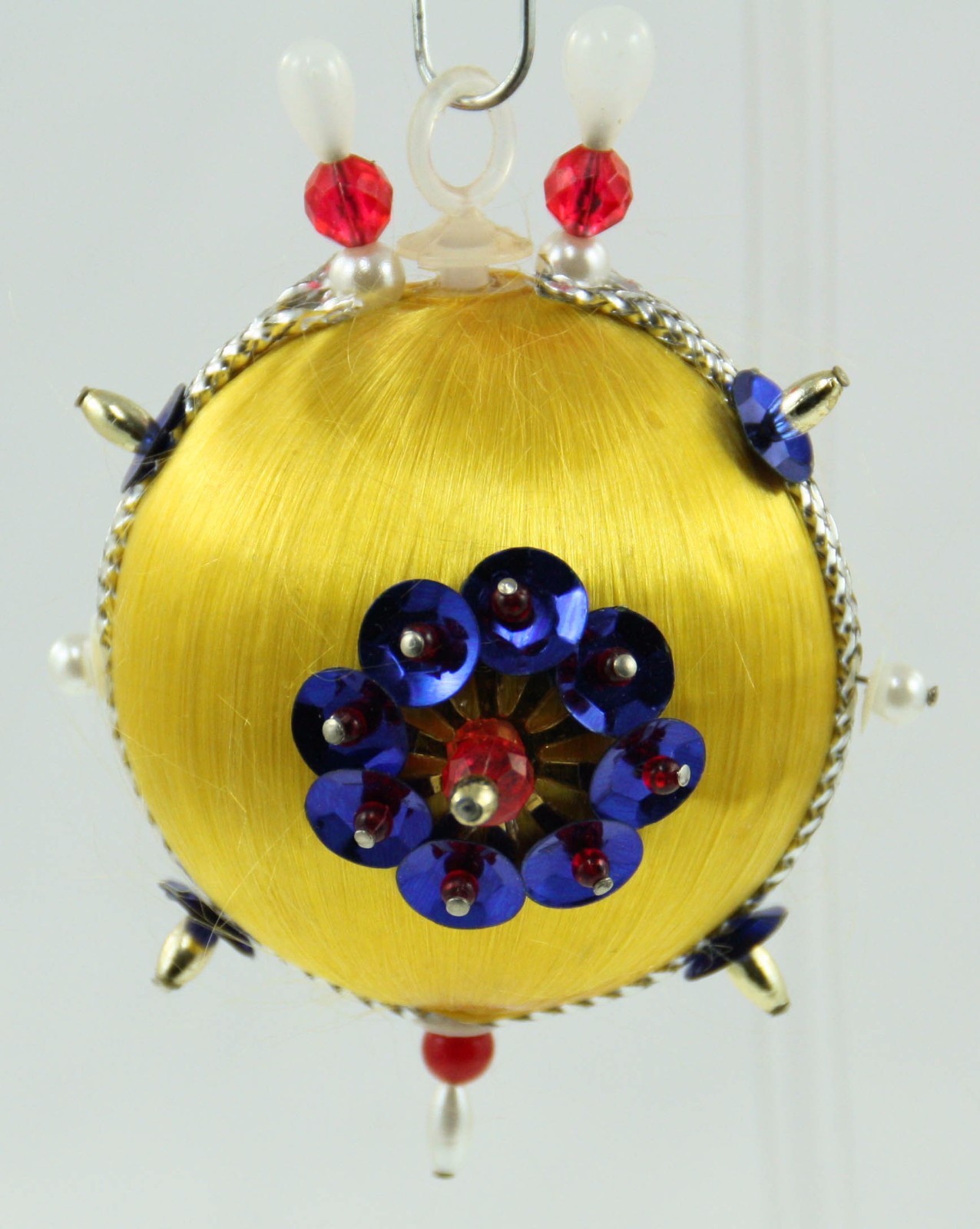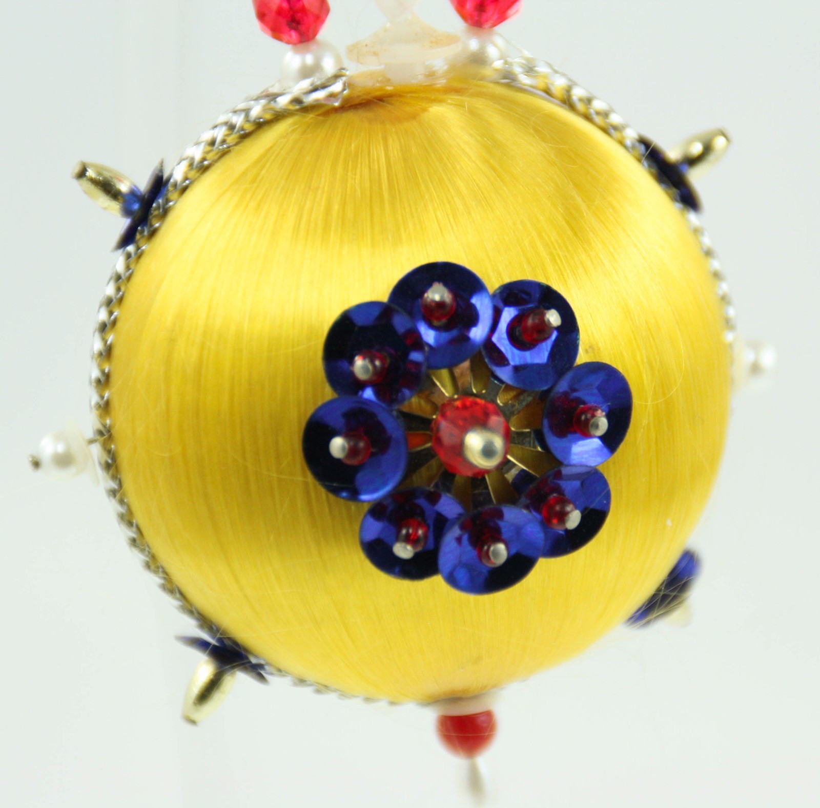 Christmas Ornament Yellow Silk Bead Pearl Jewel Ball Measures approximately 3" x 3" Please see pictures for details and condition. Condition is subjective and items are sold as is but I would be happy to answer questions or provide more pictures if needed. Also please let me know if you are not satisfied with your purchase for any reason before opening a case. I will work hard to make sure you are satisfied and you can always start a case if you are not happy with my response. I have a pretty relaxed return policy so if you don't like something I am happy to take it back. As always, if you have information that could help me improve my listing please share the knowledge and let me know. Thank you Check out my other items !