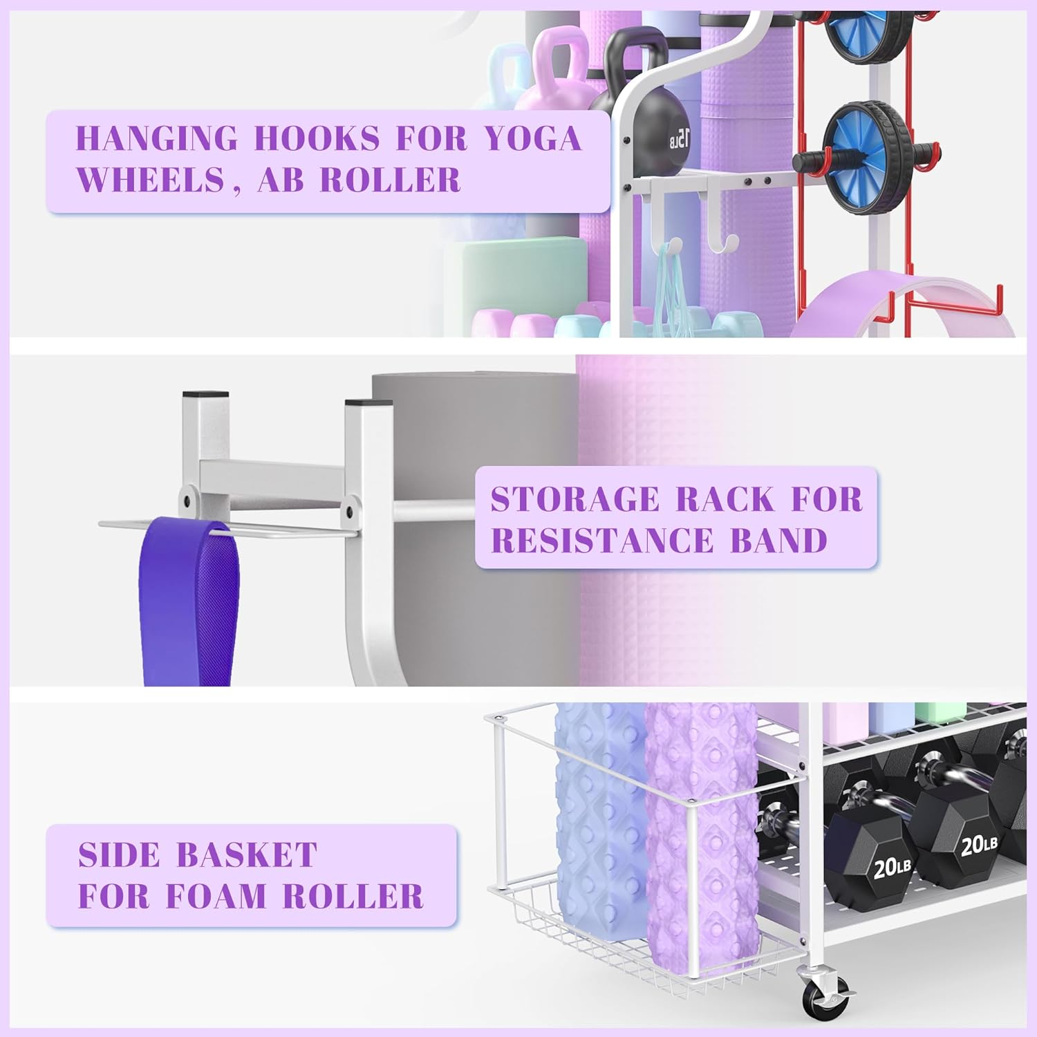 Store New Arrivals Add to Favorite View Feedback Contact Yoga Mat Storage Racks,Home Gym Storage Rack for Dumbbells Kettlebells Foam Roller, Yoga Strap and Resistance Bands, Workout Equipment Storage Organizer with Hooks and Wheels Description Part Number M721W Style Hanging Item Dimensions LxWxH 15.71 x 40.39 x 34.29 inches Color White Product Dimensions 15.7"D x 30.5"W x 34.3"H Material Alloy Steel Package Weight 9.08 Kilograms Weight Limit 35 Kilograms Item Weight 5 Pounds Number of Racks 3 Frame Type Rectangular Frame Item Package Dimensions L x W x H 35.28 x 16.22 x 4.25 inches Included Components Casters STORAGE VARIOUS ITEMS: This workout storage organizer can help to store your yoga mat, dumbbells, kettlebells, yoga brick, resistance band,roller wheel, foam roller etc.. Perfect for fan of yoga. WELL-MADE QUALITY STORAGE RACK: The yoga mat rack is made with high quality powder coated finish steel, the whole construction is sturdy and durable which can be use for years. And it is suitable for many occasions, such as gym, personal home gym, fitness club and garage. HEAVY DUTY CASTERS: The home gym storage rack comes with 4 strong 360-degree wheels (2 lockable) and can easy to move indoor and outdoor as well as any places you want to use. LARGE CAPACITY STORAGE ORGANIZER: The storage rack is quipped with 3 layers of metal mesh, a side basket, 3-sectional iron holder and several hanging hooks which can store for various yoga gear and exercise equipment. EASY TO ASSEMBLE: The dimension of this gym organizer is 40.4 inch(L) x 15.7 inch(W) x 34.3 inch(H). With the help of instruction, you can easy install the whole unit. Product Description OTHER HOME GYM STORAGE RACK FROM MYTHINGLOGIC Add to Cart Add to Cart Add to Cart Add to Cart Large weight rack Customer Reviews 4.7 out of 5 stars 1,497 4.7 out of 5 stars 1,497 4.7 out of 5 stars 182 4.7 out of 5 stars 182 — Price $89.99 $ 89 . 99 $84.99 $ 84 . 99 $109.99 $ 109 . 99 $169.99 $ 169 . 99 — Material Metal Metal Metal Metal Metal Surface Powder coated Powder coated Powder coated Powder coated Powder coated Dimension 30.5"x 15.7"x 34.3" 30.5"x 15.7"x 34.3" 34.3''x12.2''x37'' 51.4‘’x 15.7‘’x 36.6‘’ 30.5” x 15.7”x 62.2” Wheels ✔ ✔ ✔ ✔ ✔ Assemble required ✔ ✔ ✔ ✔ ✔