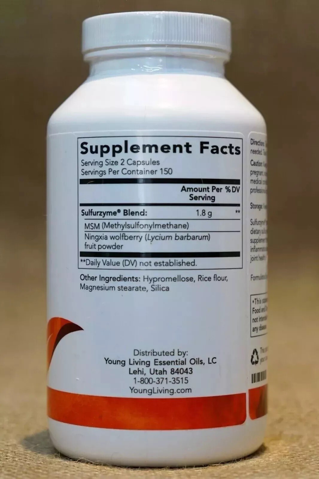** US STOCK - FAST & FREE SHIPPING ** Young Living Essential Oils - Sulfurzyme Supplement - 300 Capsules New/Sealed Power your get-up-and-go with Sulfurzyme capsules, the perfect sidekick to your active lifestyle! Our formula gives you a daily dose of dietary sulfur (MSM) to support your joint’s range of motion and recovery time, as well as a healthy inflammation response.* We’ve also included a secret ingredient—Ningxia wolfberry fruit powder—for an extra boost of antioxidants, including vitamins C and E. DIRECTIONS Take 2 capsules 2 times daily or as needed 1 hour before or after meals. Use as part of your workout routine. FEATURES AND BENEFITS Supports joint health* Supports recovery time of joints after exercise* Supports a normal range of motion* Supports a healthy inflammation response* May support normal metabolic functions and circulation* May support the immune system* Supports hair, skin, and nail health* SAFETY Keep out of reach of children. If you are pregnant, nursing, taking medication, or have a medical condition, consult a health care professional prior to use. Shipping This item is IN STOCK from warehouse in USA and ready to ship within 24 hours. We strive to make the shipping process as easy as possible. Most of our items ship out within 24-48 hours and take 3-8 days for delivery. If you have any questions about our shipping policy or delivery times please don't hesitate to contact us. We DO NOT ship to the following: PO BOX & APO/FPO Addresses Hawaii, Alaska, Puerto Rico, & Virgin Islands. We ship to the continental 48 US States Only.