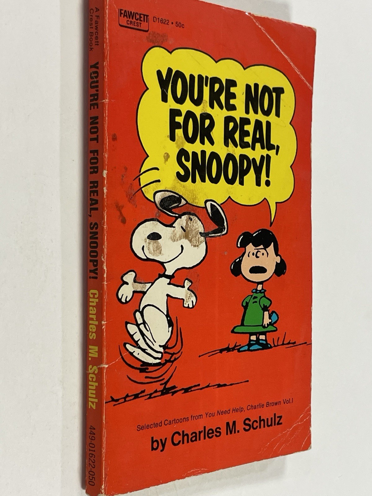 Author:Charles M. SchulzFormat:PaperbackTopic:Cartooning, HumorPublication Year:1971Book Title:You're Not For Real, Snoopy!Vintage:YesGenre:Children & Young Adults, Comics, HumorFeatures:IllustratedOriginal Language:EnglishNarrative Type:Fictiongtin13:DoesNotApplyLiterary Movement:TusslebugsBook Series:Charlie Brown SeriesLanguage:EnglishCountry of Origin:United StatesPublisher:FawcettISBN:DoesNotApply