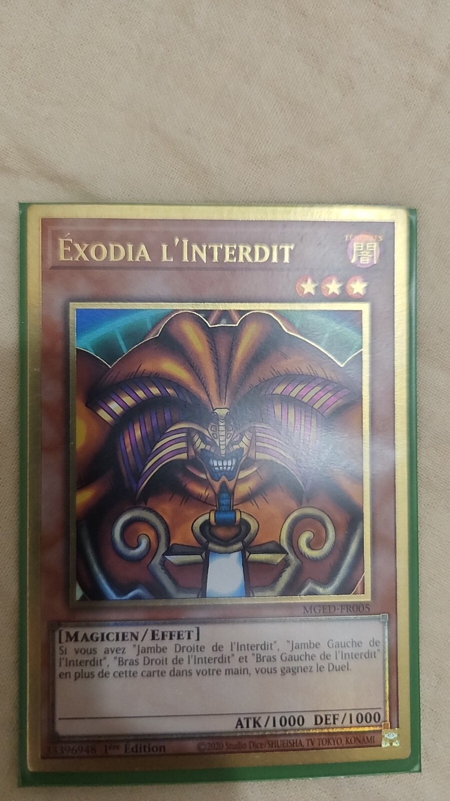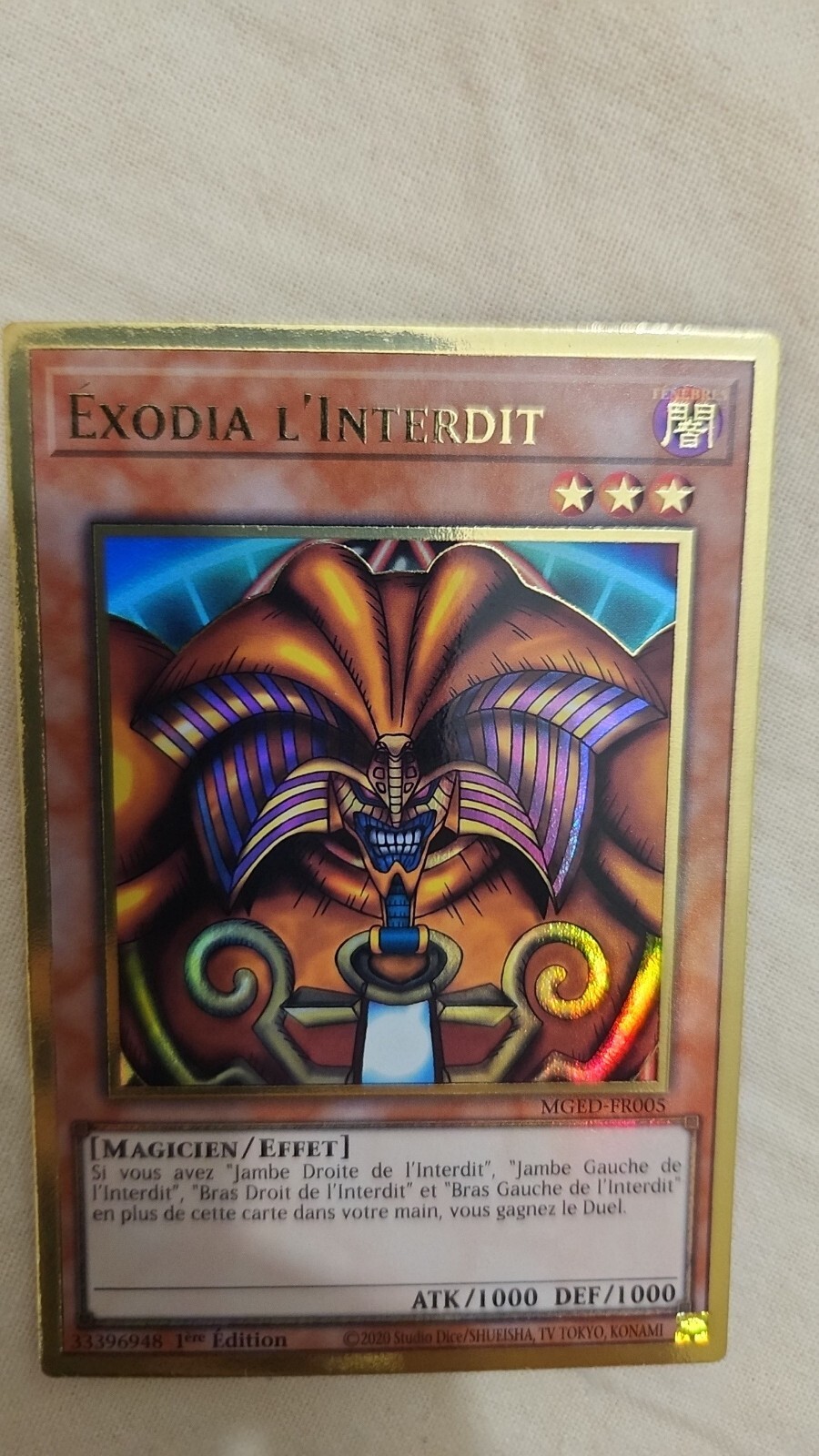 Official Yu-Gi-Oh! card: Exodia the Forbidden One (MGED-FR005) – Super Rare Gold Secret Rare. French version. - Condition: Exceptional, near mint. - Obtained brand new on April 26, 2025, and kept since then in a very secure place. - Always protected with a high-quality hard case to prevent any stains, bends, or damage. - Golden shiny finish. - Authentic, published by Konami. - Fast, careful, and ultra-protected shipping.