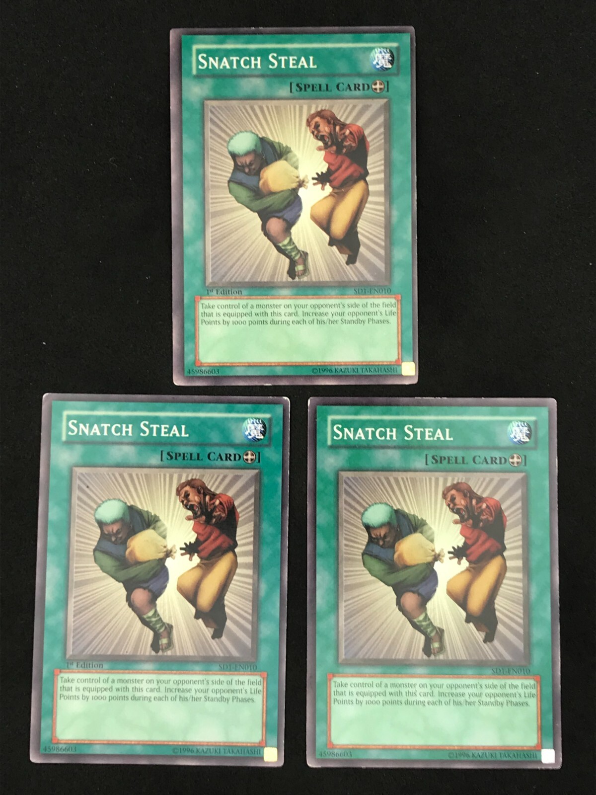 Listing is for a playset of 3x Snatch Steal YuGiOh cards. Th e condition and edition of the playset is specified in the drop down list. The pictures associated with the selection in the drop down list are of the actual cards you will receive. Condition of the card is as pictured. Card will ship in a plain white envelope via Ebay Standard Envelope service. Additional cards ship free when purchased at the same time using the cart feature. The cards must be purchased at the same time and not individually for the shipping discount to be automatically applied. Shipping by Bubble Mailer using USPS Ground Advantage is also available under shipping options for an additional charge. International Buyers - I use the eBay International Shipping Program for international shipments. The international portion of the shipment is handled by eBay and the shipping price is set by eBay. I have no control over the shipping price they set.