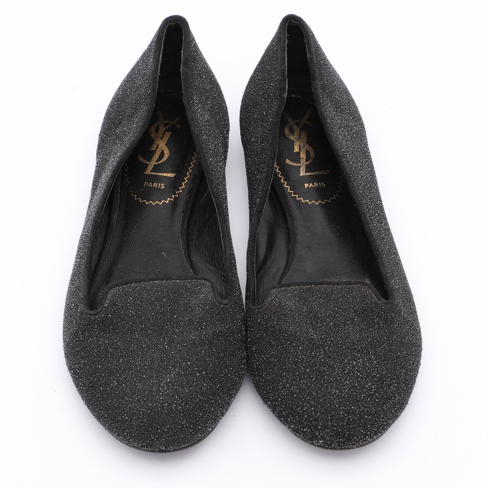 Coming from one of the most celebrated fashion house, these smoking slippers are known for their brilliant craftsmanship. A seamless mix of comfort and style, these smoking slippers will add a refined touch to your ensemble without too much effort.Certified by The Luxury Closet - This item has gone through a detailed authentication process overseen by our experts. We offer a lifetime guarantee of authenticity on all our items. Import duties, taxes and charges are not included in the item price. These charges are the buyers responsibility. Please check with your country’s customs office to determine what these additional cost will be prior to buying. Our eBay Store About Us Contact Us Add to Favorite Sellers Yves Saint Laurent Black Glitter Smoking Slippers Size 34 $165 Coming from one of the most celebrated fashion house, these smoking slippers are known for their brilliant craftsmanship. A seamless mix of comfort and style, these smoking slippers will add a refined touch to your ensemble without too much effort. Product Details Brand Color Black Dimensions Material Glitter Size 34 Outsole Width 7 cm Outsole Length 23 cm Heel Height Includes Original Dustbag Certified by The Luxury Closet This item has gone through a detailed authentication process overseen by our experts. We offer a lifetime guarantee of authenticity on all our items. How We Check The in-house team of experts at The Luxury Closet is highly trained to verify the authenticity and the condition of the luxury products. They ensure that only 100% authentic items are put on sale.The evaluation process is unique with its own mix of assessment criteria and differs according to the category. Each item is evaluated based on the following combination of hallmarks, hardware, stitching, symmetry, material, craftsmanship, stamping, codes, hologram stickers, and packaging. Our authenticators also check if the items have been modified or amended (e.g., aftermarket diamonds, replaced batteries, repaired bags, etc.) International Buyers Import duties, taxes and charges are not included in the item price. These charges are the buyers responsibility. Please check with your country’s customs office to determine what these additional cost will be prior to buying.