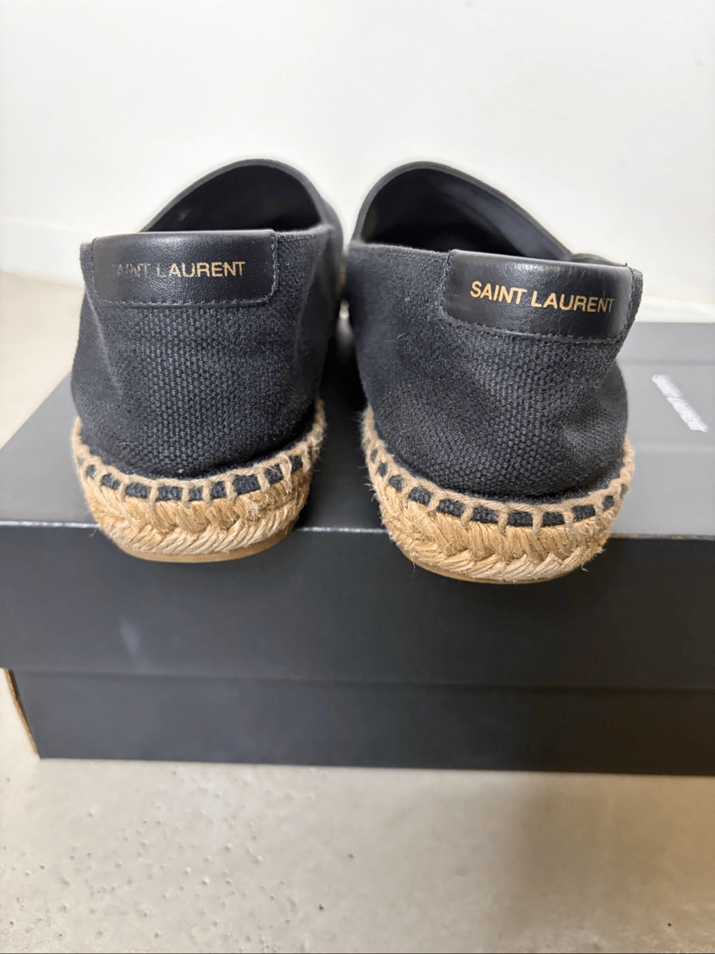 Yves Saint Laurent Canvas Logo Espadrilles Closed toe Leather back Canvas Shoes show wear, see photos Color: Black Embroidered Saint Laurent on sides Size: 37.5= US 7 Comes in original box Good Condition