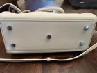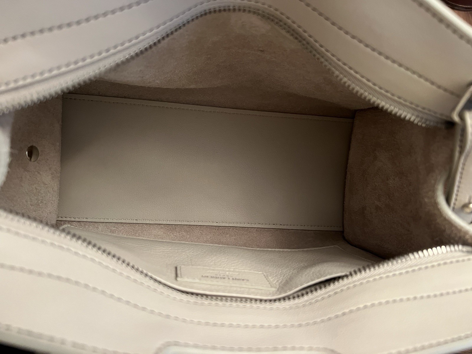 This spacious Yves Saint Laurent top handle bag is crafted from luxurious leather with silvertone logo clasp. Authenticity card included. double top handles Snap flap closure Protective metal feet Silvertone hardware One inside slip pocket Leather Made in Italy SIZE: Removable, adjustable shoulder strap, 22" drop 3 lbs. 10"W x 7"H x 5"D