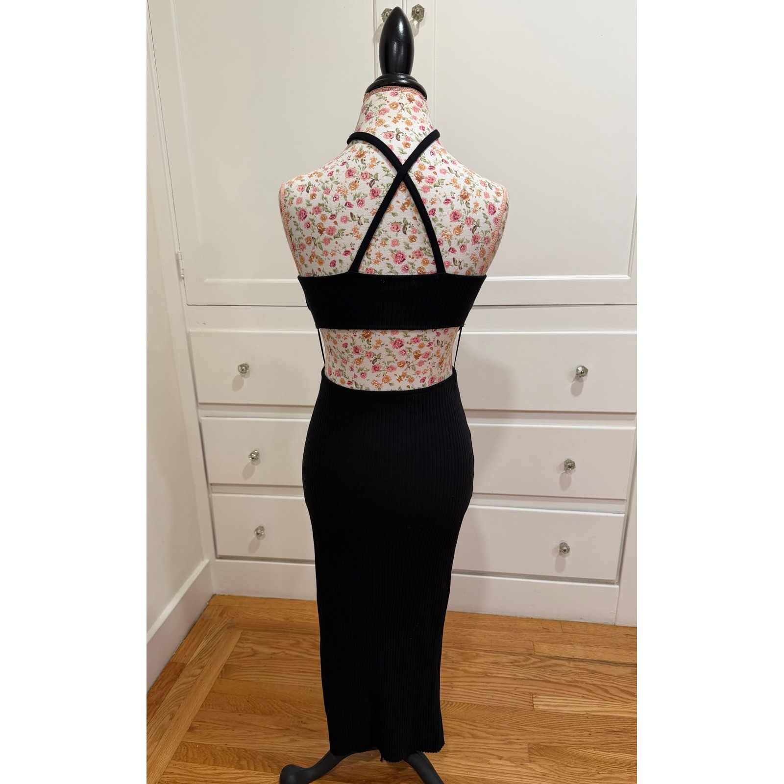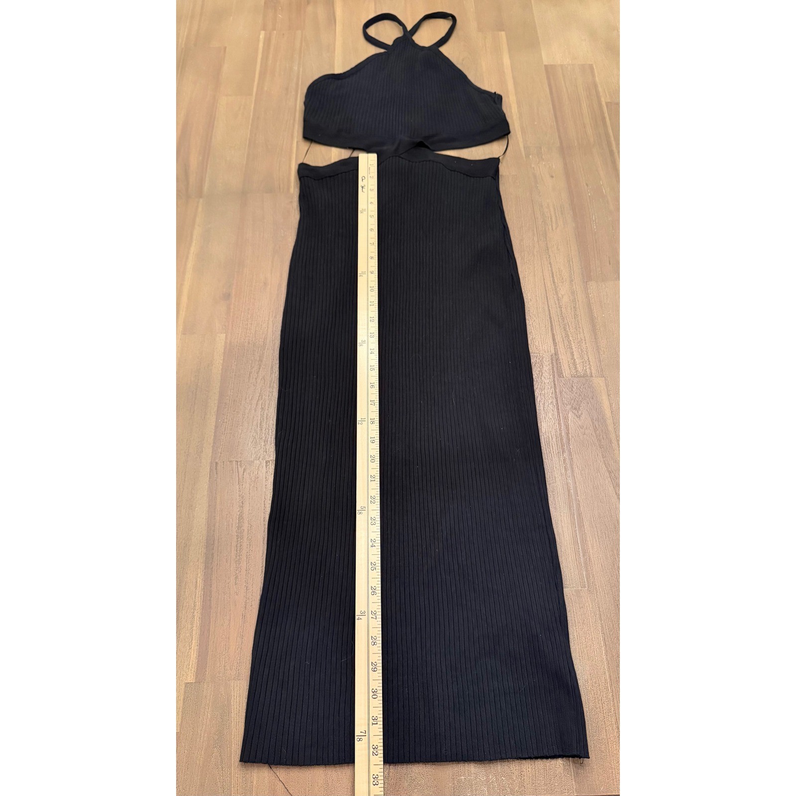Sculpt a stunning silhouette in this ZARA black ribbed midi dress. The alluring halter neckline gracefully leads to a daring cutout at the waist, revealing just the right amount of skin. Crafted from a comfortable ribbed knit, this dress hugs your curves beautifully, creating a sophisticated and modern look. Perfect for a night out, a chic dinner date, or a glamorous evening event. Measurements: • Bust: 16 in • Waist: 12 in • Length: 45 in Style: Bodycon, Maxi Dress Length: Long Department: Women Sleeve Length: Sleeveless Pattern: Solid Occasion: Party/Cocktail, Casual Material: Ribbed Knit Fabric Type: Knit Theme: Clubwear Neckline: Halter Season: Summer, Spring Sleeve Type: Strappy Sleeve Closure: Pullover Accents: Strap Features: Cut Out, Backless Keywords: ZARA, black dress, ribbed dress, halter neck, cutout dress, midi dress, bodycon, evening dress, cocktail dress, glamorous, night out, date night, sophisticated, modern