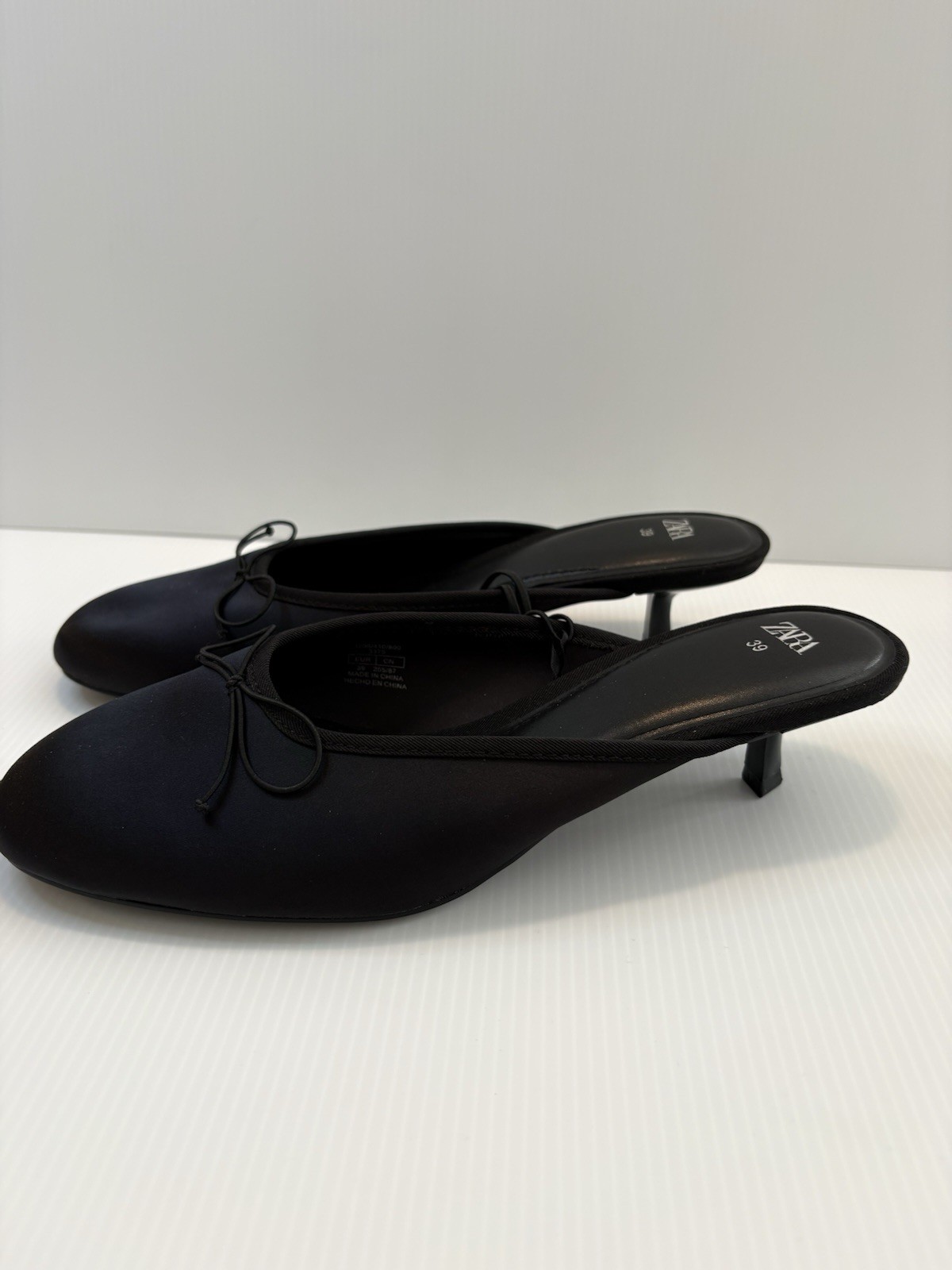 Zara Bow Heeled Mules in black. They feature a maxi bow detail on the front, a pointed toe, and a high stiletto or kitten heel. Product Details Feature Detail Brand Zara Style Mule, slip-on, high-heel Material Satin-effect fabric (Polyester upper) Toe Shape Pointed toe Heel Height Approx. 2.4 inches (6 cm) to 2.8 inches (7 cm) Color Black Size 8 New with tags No box Black Slip on Beautiful mules ✨ Shipping the Same Day 📦 Shipped with care 🔄 30-Day Free Returns (under not as described 💖 Thank you for shopping at Karo’s