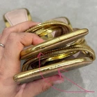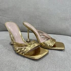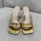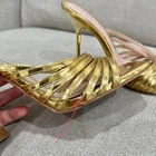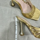 Stylish metallic gold strappy heeled mules by ZARA. These feature a glossy finish, square toe, and flared stiletto heel — perfect for parties, nights out, or adding a statement touch to any outfit. Condition: Fair preowned condition — still very wearable. Multiple flaws shown in photos including scuffs, insole wear, and marks on the straps and soles. Please review all pictures carefully.