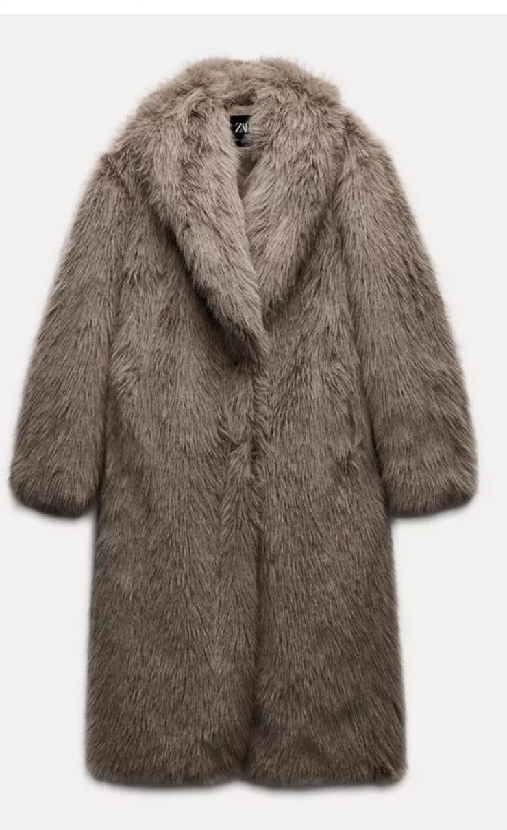 Embrace the colder seasons with elegance in this ZARA Long Faux Fur Coat, a luxurious addition to your wardrobe. The coat is crafted in taupe grey, a versatile hue that complements any outfit, and features a sumptuous faux fur fabric that offers both warmth and style. With a size S fit, it's designed to flatter a regular size type, ensuring a comfortable and sophisticated silhouette. Attention to detail is evident in the coat's long length, providing ample coverage and a timeless look. It boasts a classic collared style, secure button closure, and practical pockets for your essentials. Perfect for autumn and winter, this coat is an essential for those seeking both fashion and function in their outerwear.