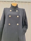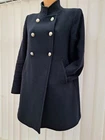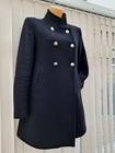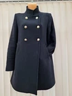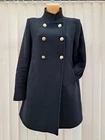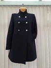 This Zara women's coat is a stylish navy blue military jacket made from a wool blend with a double-breasted design and long sleeves. It features a short length and a regular fit in size Medium (UK 12). The coat has a button closure, acetate lining, and includes pockets, making it suitable for casual occasions during the autumn and winter seasons. The garment care recommendation is dry clean only, maintaining the quality of this fashionable and versatile outerwear piece. In very good used condition