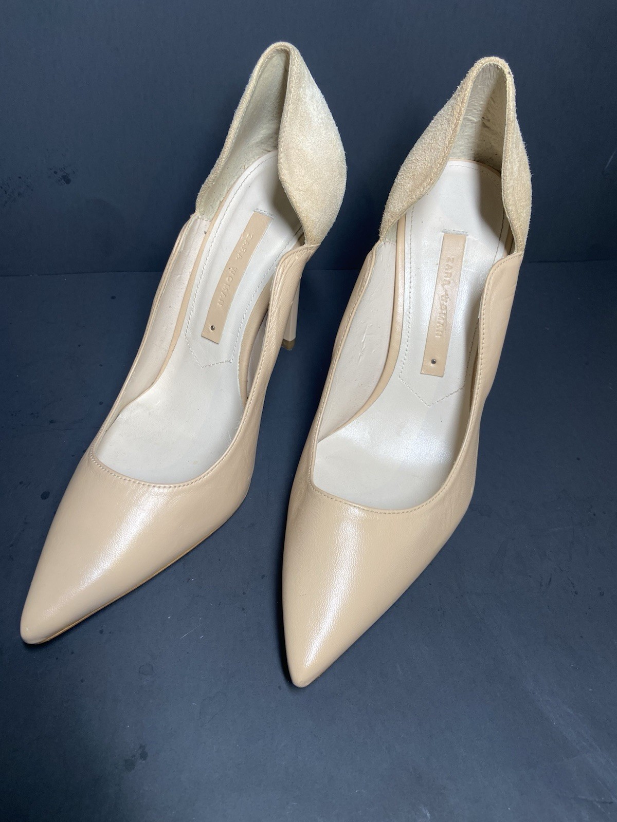 The Zara Woman Collection Nude Heels in size 6 US / 36 EU are stylish and elegant shoes perfect for various occasions. Featuring a pointed toe and ultra-high stiletto heel, these slip-on heels in a solid beige color are versatile and chic. Made from leather and suede, these pumps are designed for women who want to make a statement with their footwear, whether it's for a wedding, going out, or adding a touch of glamour to their outfit. The Zara brand ensures quality and sophistication in these art-inspired heels that are sure to turn heads.