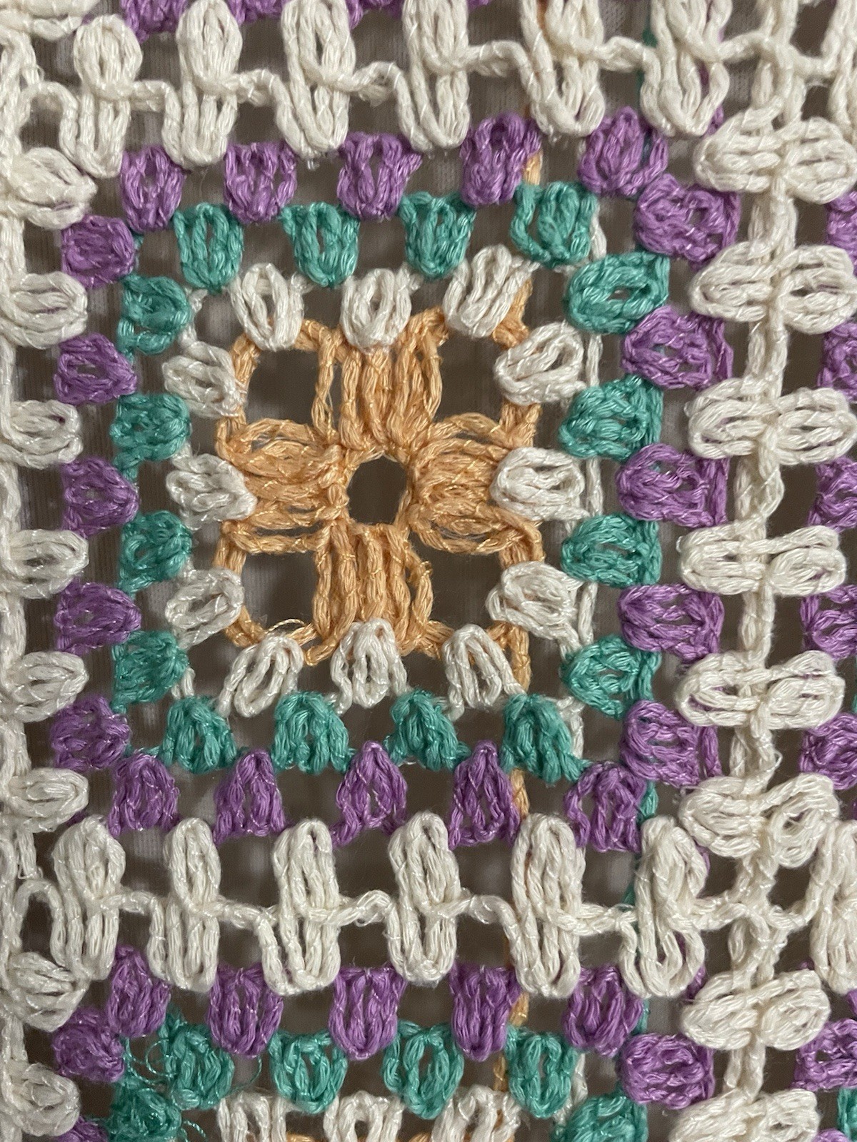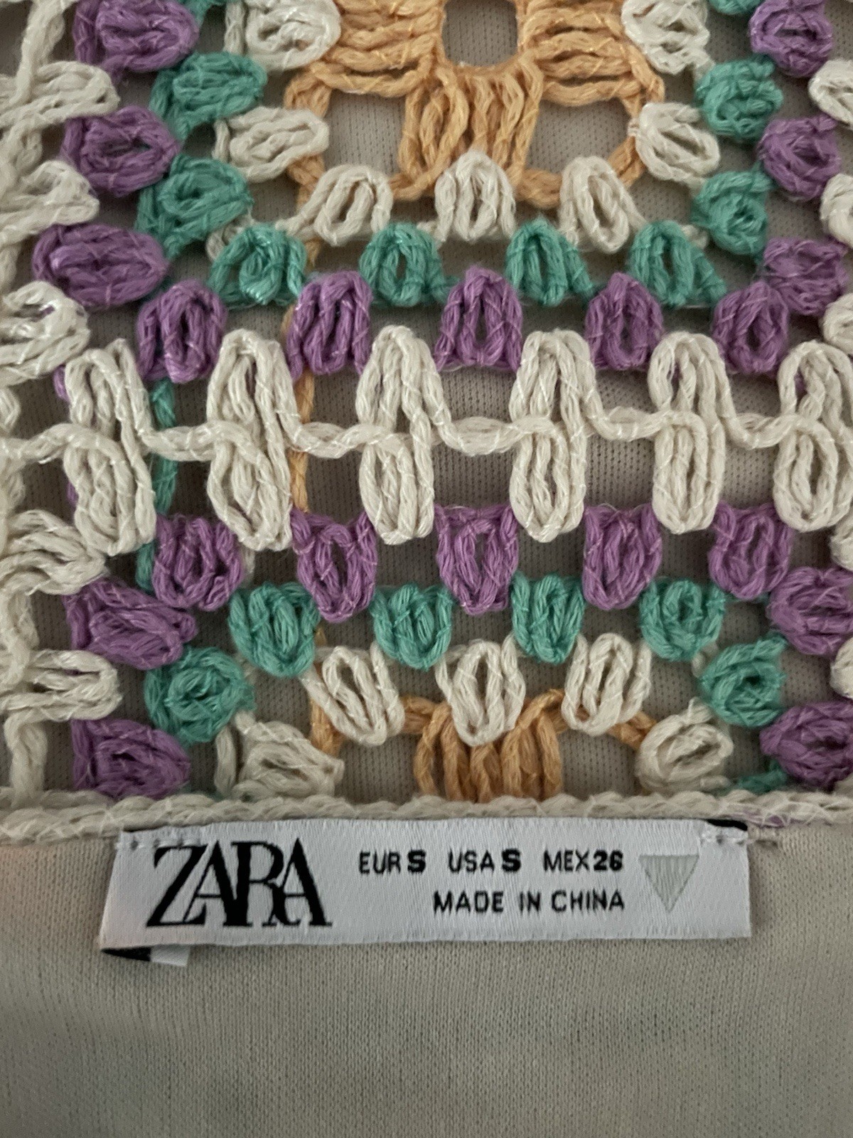 The ZARA multicolor patchwork crochet Granny Square mini beach boho dress is a stylish and comfortable option for a casual summer outing or travel. The sleeveless design, round neck, and pullover closure make it easy to wear and perfect for a relaxed day by the beach. The colorful patchwork pattern, crochet accents, and bohemian theme give it a fun and hippie vibe. Perfect for a small size (S) woman who loves the beachy, boho look.