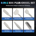 ZELCAN Chisel Set with SDS Plus Shanks, 6pc Masonry Concrete Drill Bit Set, Tile Grooving Scraping Flat Point Scaling Chisels 40Cr Steel Rotary Hammer Drill Tool Kit SDS Plus Bits for Home Improvement Product Details Brand: ZELCAN Handle Material: Alloy Steel Blade Edge: Straight Blade Material: Alloy Steel Product Dimensions: 10"L x 3"W ALL-IN-ONE KIT: Zelcan's 6 piece chisel set includes tile, grooving, scraping, flat, point, and scaling chisels, so you can work on any material from ceramic tile to concrete, brick, and masonry to real and artificial stone, including granite SDS PLUS SHANKS: These drill bits slot perfectly into your SDS Plus hammer drill regardless of manufacturer, compatible with Bosch, DeWalt, Makita, Milwaukee, Hilti, or any other NON-SLIP CONNECTION: Our handles are crafted for tight nonslip use thanks to the precise grooves and powerful torsion resistance, giving you a long-lasting service life even under punishing use HEAVY-DUTY CONSTRUCTION: This SDS Plus drill bit set is made from high quality chromium steel that has been drop forged and heat tempered to give you optimal strength and superb corrosion resistance VERSATILE USE: Change each SDS Plus bit quickly and conveniently to handle different demolition jobs, from large-area scaling to precise edge work, from tile removal to groove cutting