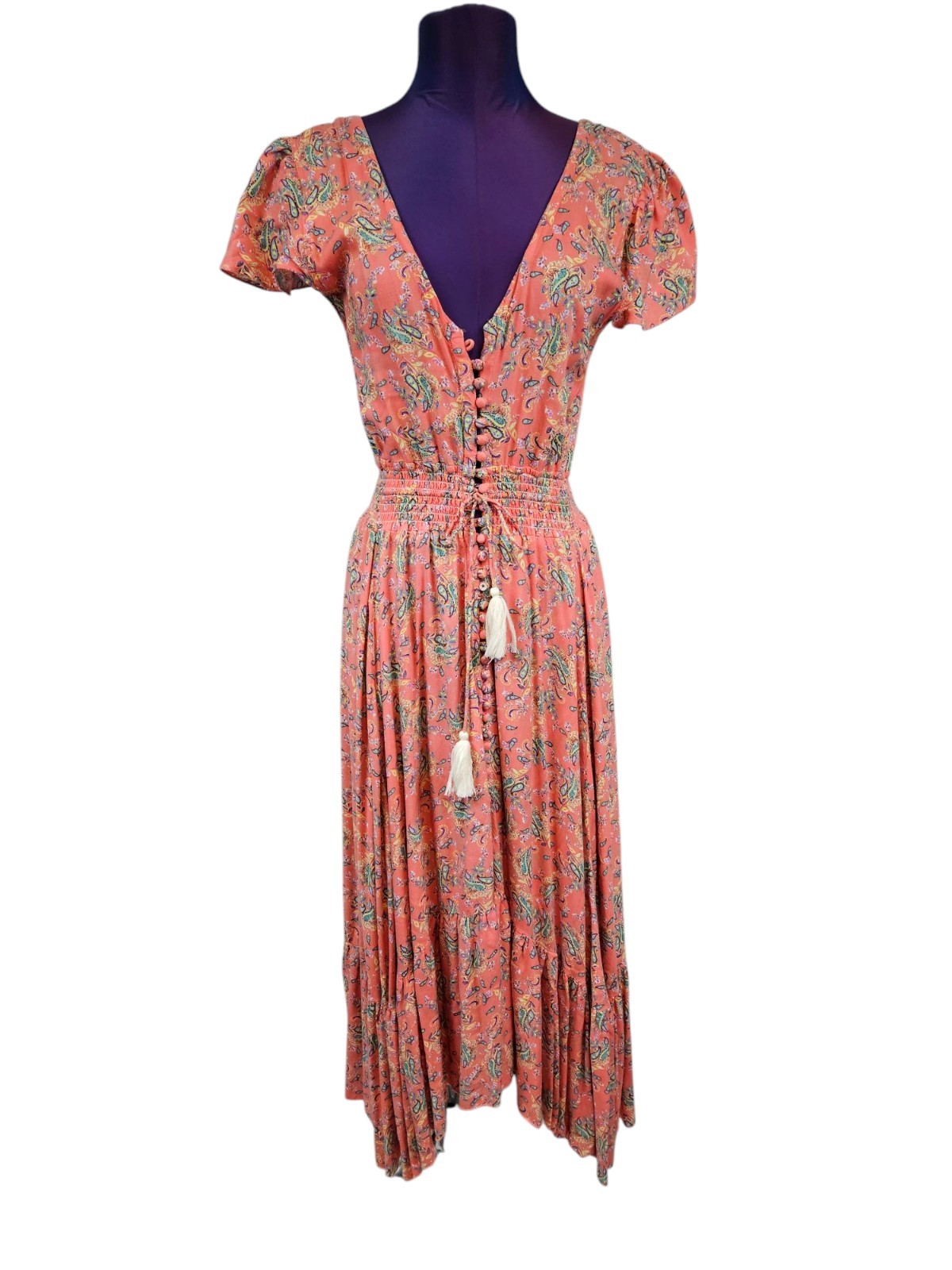 Z&L Europe Mauve Paisley Boho Chic Tiered Maxi Dress Size Small Women's N40 In good condition Z&L Europe Mauve Paisley Boho Chic Tiered Maxi Dress Size Small Women's. Features boho chic tiered maxi dress in mauve adorned in paisley print, v-neck, button and loop front closure, smocked elastic waistband with tasseled tie, short ruffle sleeves, maxi length with high low front slit and ruffle hem, open v-back with tasseled tie, festival, bohemian, coachella, feminine, resortwear. Made in India Measurements laying flat chest 16.5" front length 44" back length 54" waist 11.5" unstretched Fabric 100% viscose This is a pre-owned item that may show signs of wear. In good condition, missing top button and 1 mid section button is missing fabric cover. 14 Day returns accepted under the following conditions: Item must be in the same condition as stated If item shows additional wear buyer will receive a partial refund Buyer pays all shipping costs Refund amount will be for the item price only Please contact me prior to starting a return