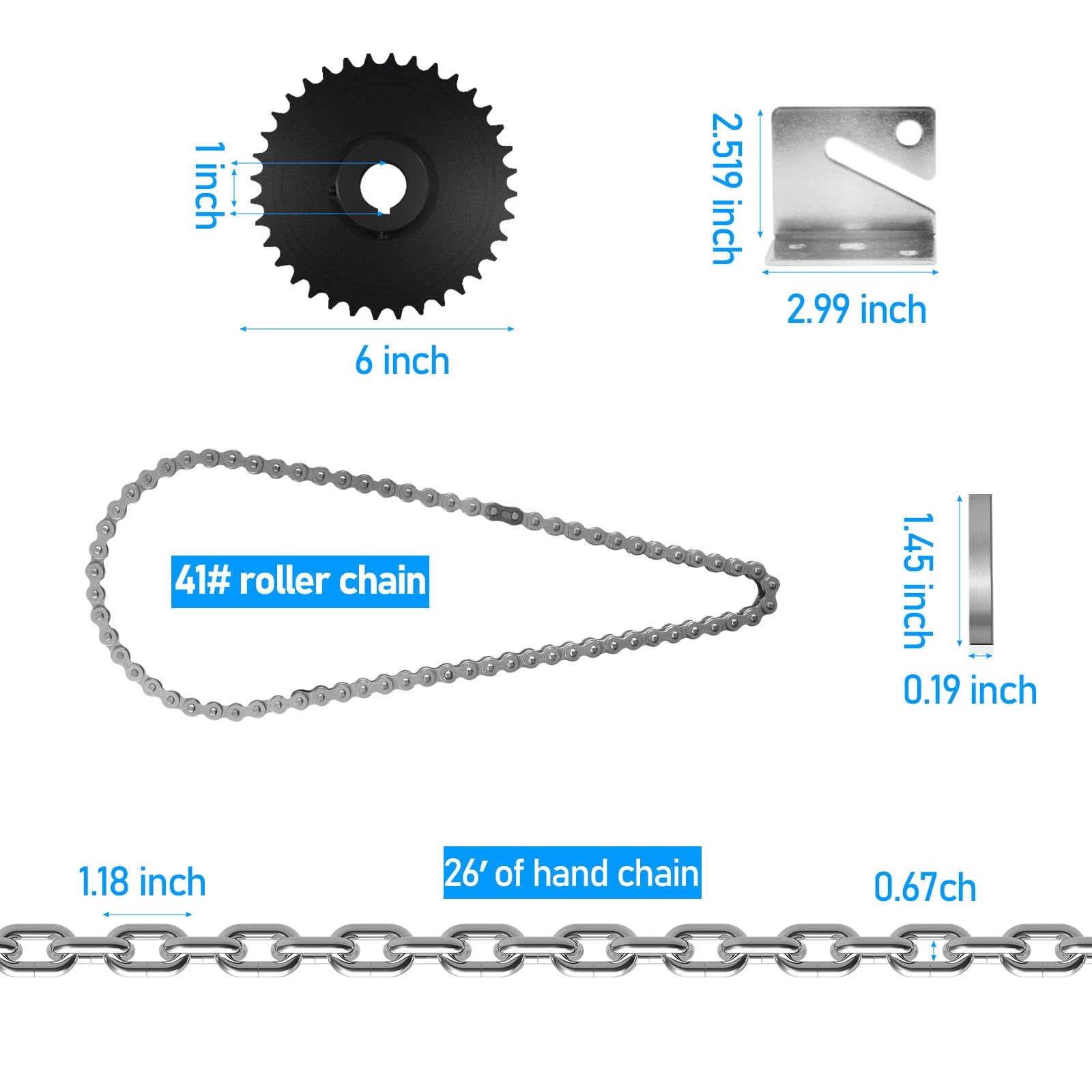 Experience Effortless Heavy-Duty Lifting! ZUIWAN 3:1 Reduced Drive Jackshaft Garage Door Opener - The Ultimate Chain Hoist Solution for Your Workshop & Roll Up Doors. Effortless Heavy-Duty Lifting---ZUIWAN's Jackshaft Garage Door Opener features a robust 3:1 Reduced Drive and 41# Roller Chain, delivering Heavy Duty performance with a 331 lbs load capacity. Lift Roll Up Doors smoothly and reliably, perfect for Workshop and Warehouse applications Superior Chain Hoist Engineering---Engineered as a premier Garage Door Jackshaft Chain Hoist, it integrates a 36" #41 Roller Chain, 26' Hand Chain, and hardened 36T Sprocket (1" Bore). This heavy-duty Chain Hoist ensures long-lasting durability for demanding Garage Door Opener needs Precision 3:1 Drive Operation---Experience exceptionally smooth operation. The optimized 3:1 Reduction Drive combined with precision ball bearings and lubricated gears minimizes effort and maximizes control when operating your Jackshaft Garage Door Opener or Roll Up Door Durable & Corrosion-Resistant Build---Constructed with high-grade, galvanized iron, this Heavy Duty Chain Hoist resists wear, rust, and deformation. Built to withstand harsh environments, it's the dependable choice for Workshop, Warehouse, and Garage Door Opener applications Complete & Universal Kit---Comes ready-to-install with all necessary hardware: Chain Keeper Bracket, 1/4" x 1-3/8" Square Key, and Set Screws. Designed for 1" Bore Sprockets, this Garage Door Jackshaft Chain Hoist offers universal compatibility for seamless integration. (Note: Additional chain may be needed for doors >14ft or vertical lifts.)